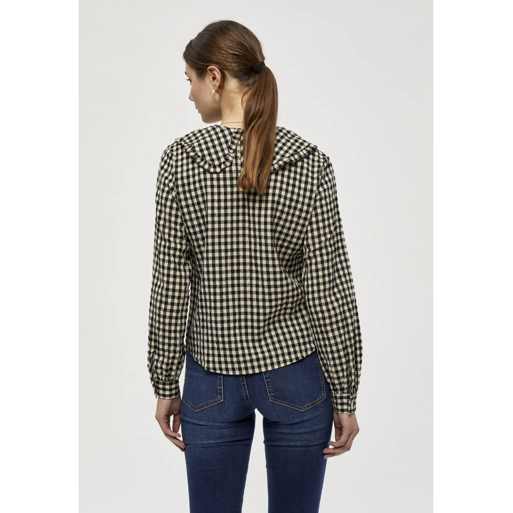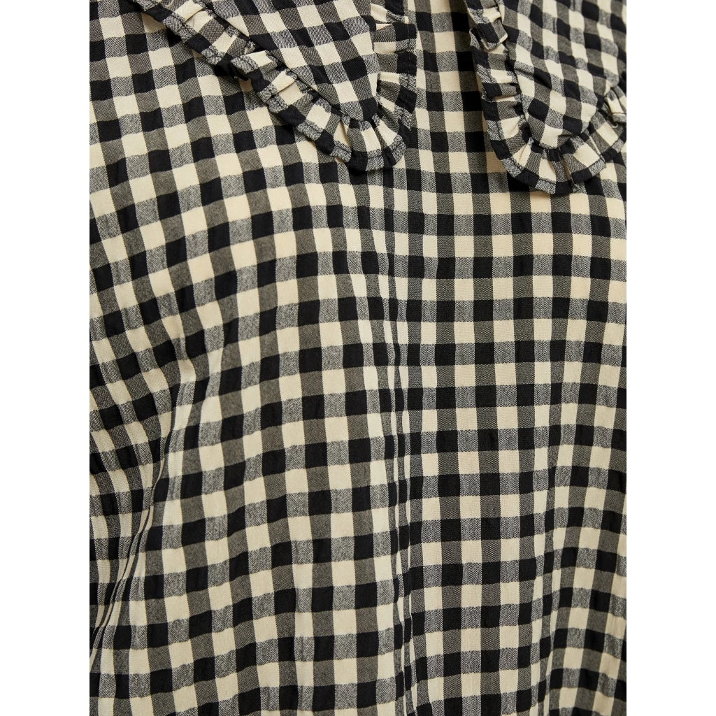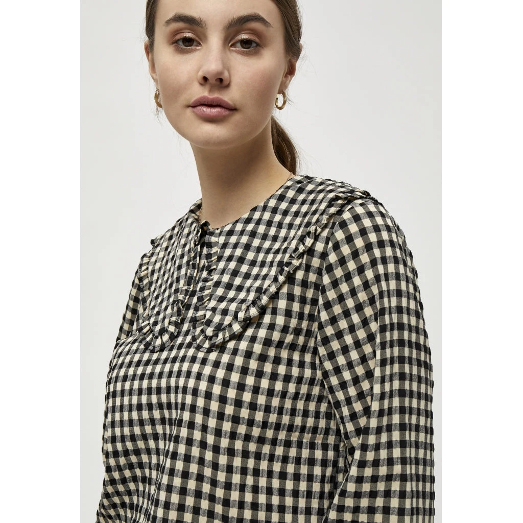 Really lovely and stylish blouse. It has long sleeves with cuffs. The blouse has a large collar with frill details. It has a nice check pattern in a rustic material. It has a slit and button closing.