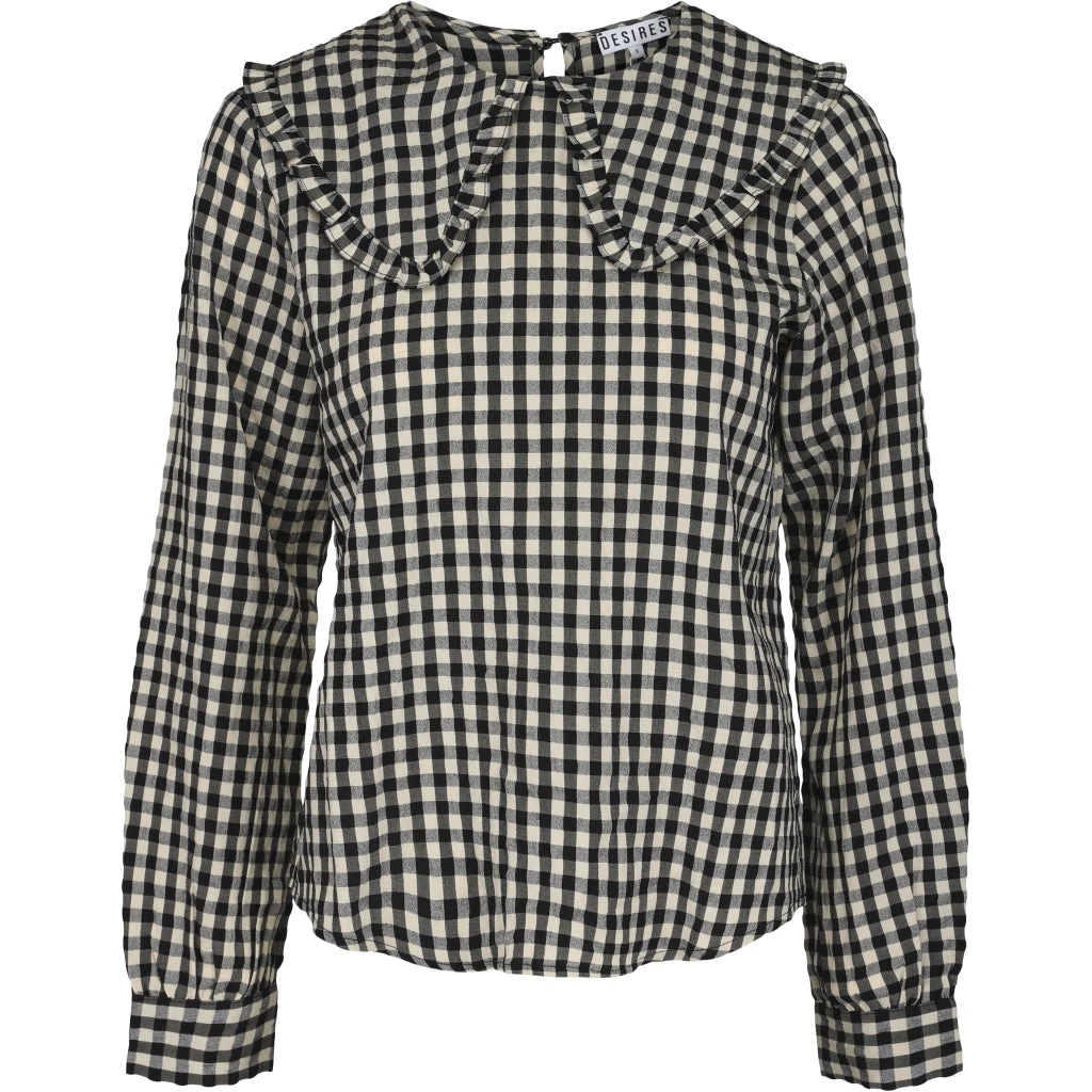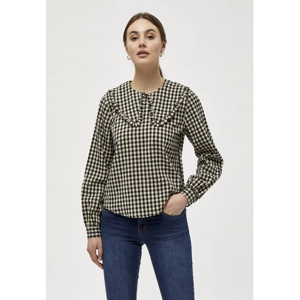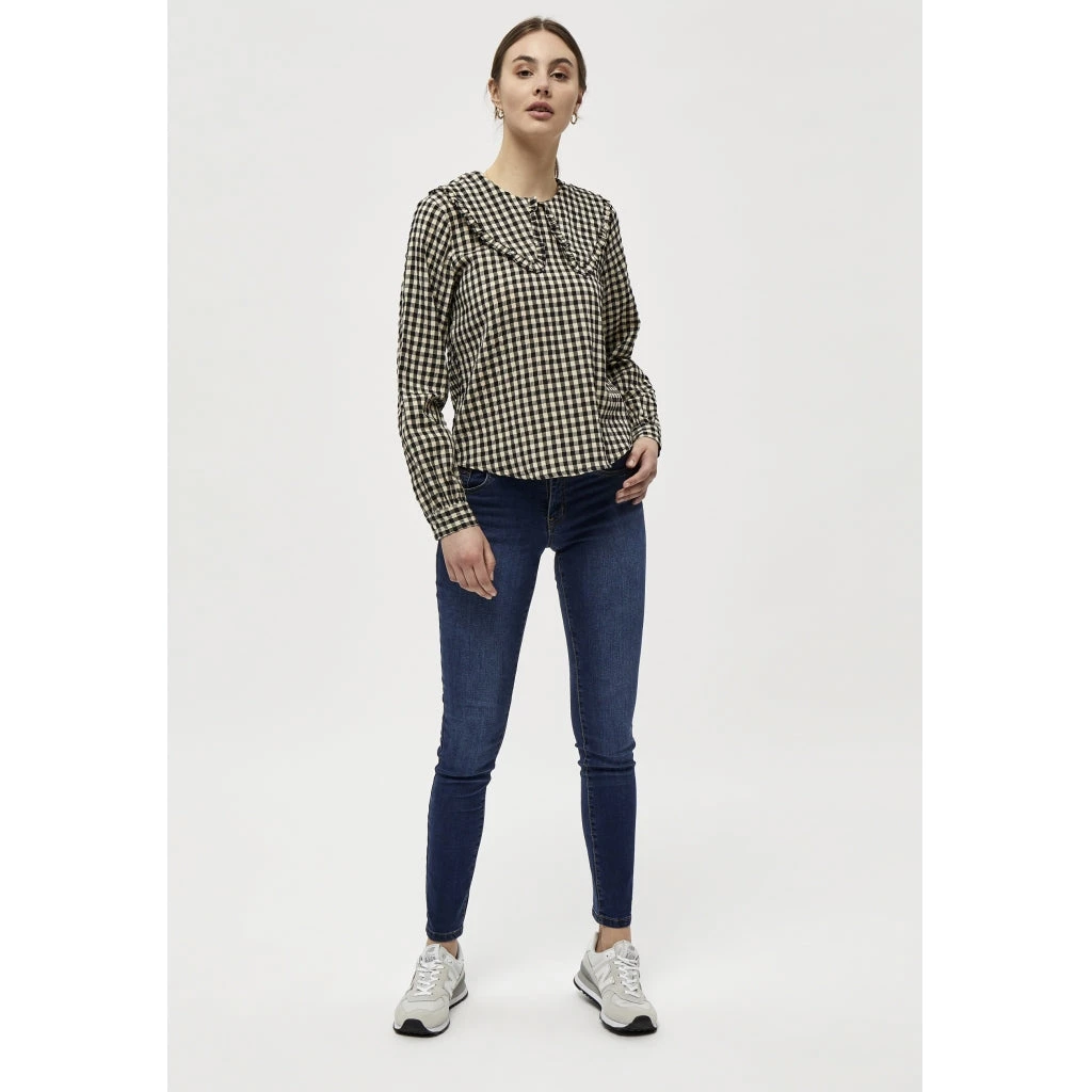 Really lovely and stylish blouse. It has long sleeves with cuffs. The blouse has a large collar with frill details. It has a nice check pattern in a rustic material. It has a slit and button closing.