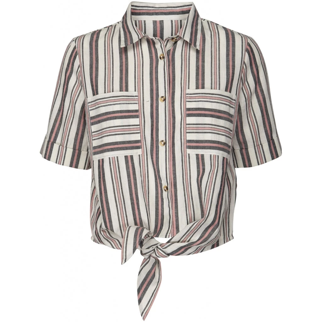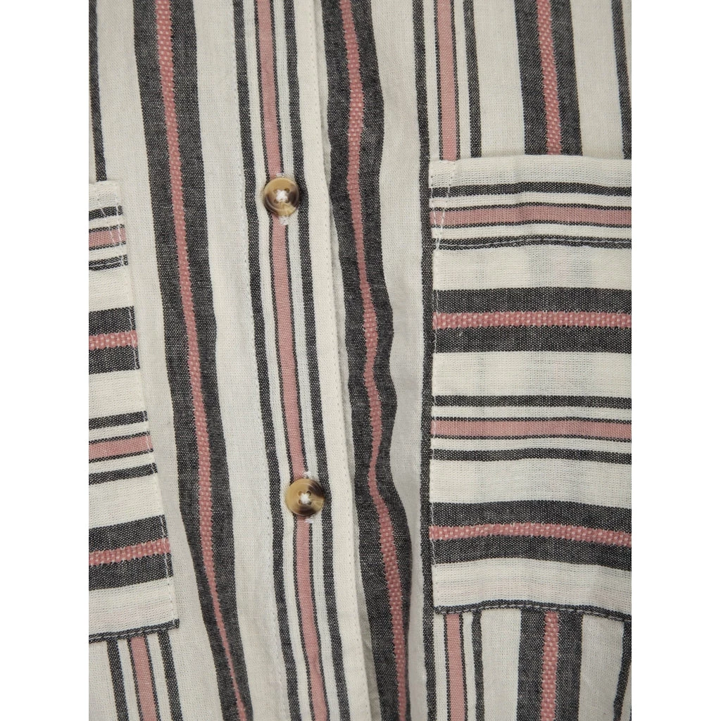 Fatana is a short sleeve shirt with chest pockets and tie-waist. The vertical stripes are interrupted by the horisontal stripes on the pockets which is a quirky detail.