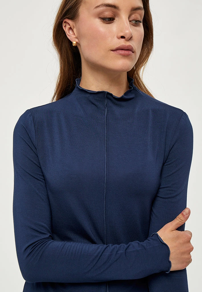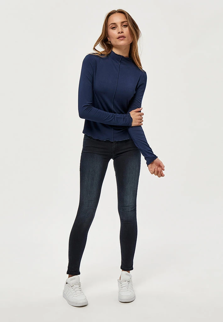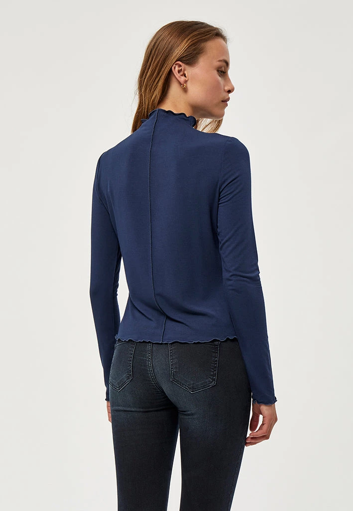 Cool blouse with details. The blouse has long sleeves and a slightly high neck. It has a lovely detail at the edges and down front making the blouse more eye catching.