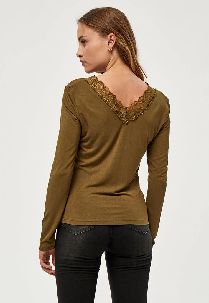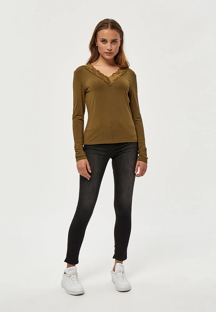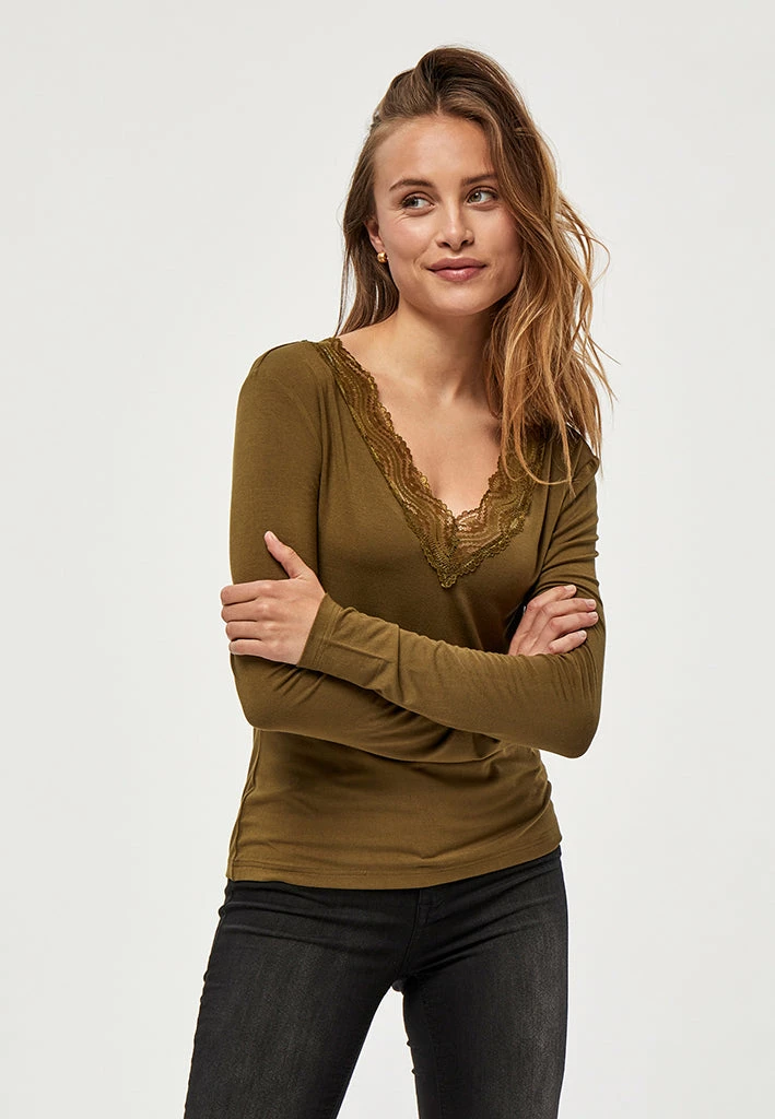Lovely blouse with lace v-neck. The blouse is tightly fitted. It is easy to style with jeans or pants.