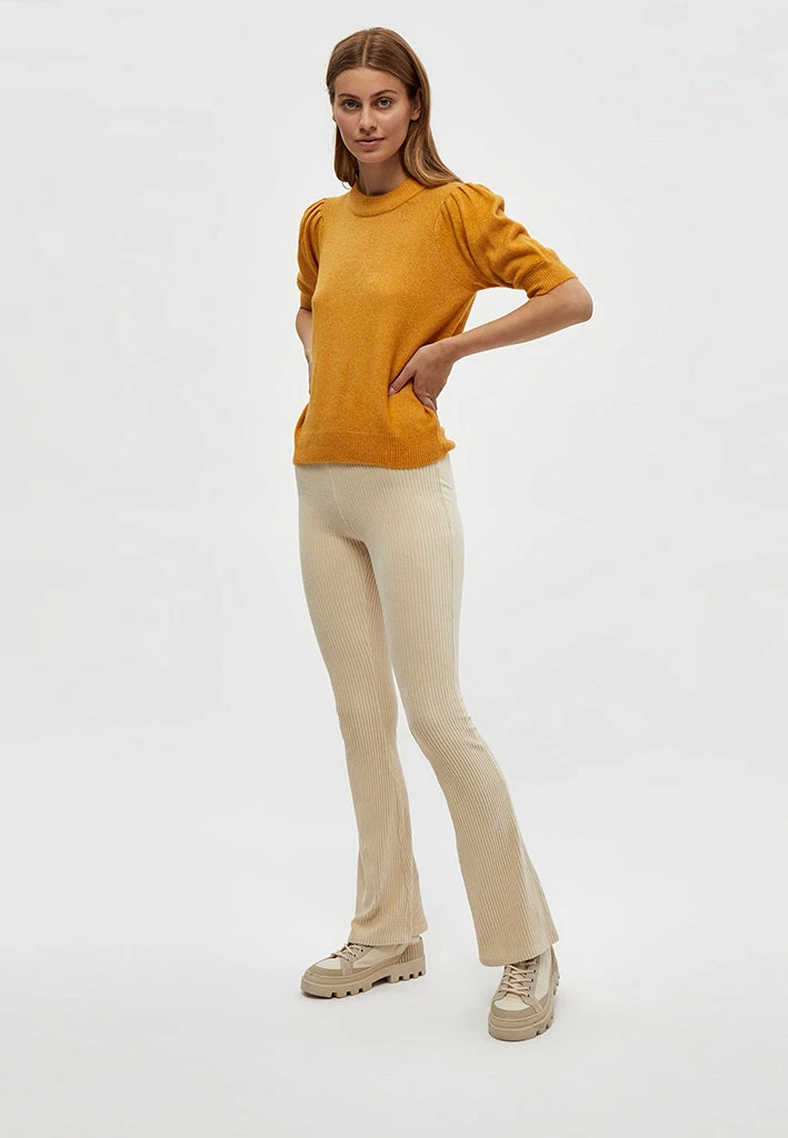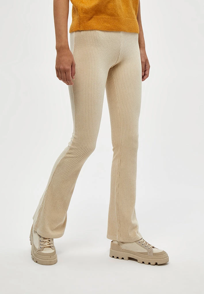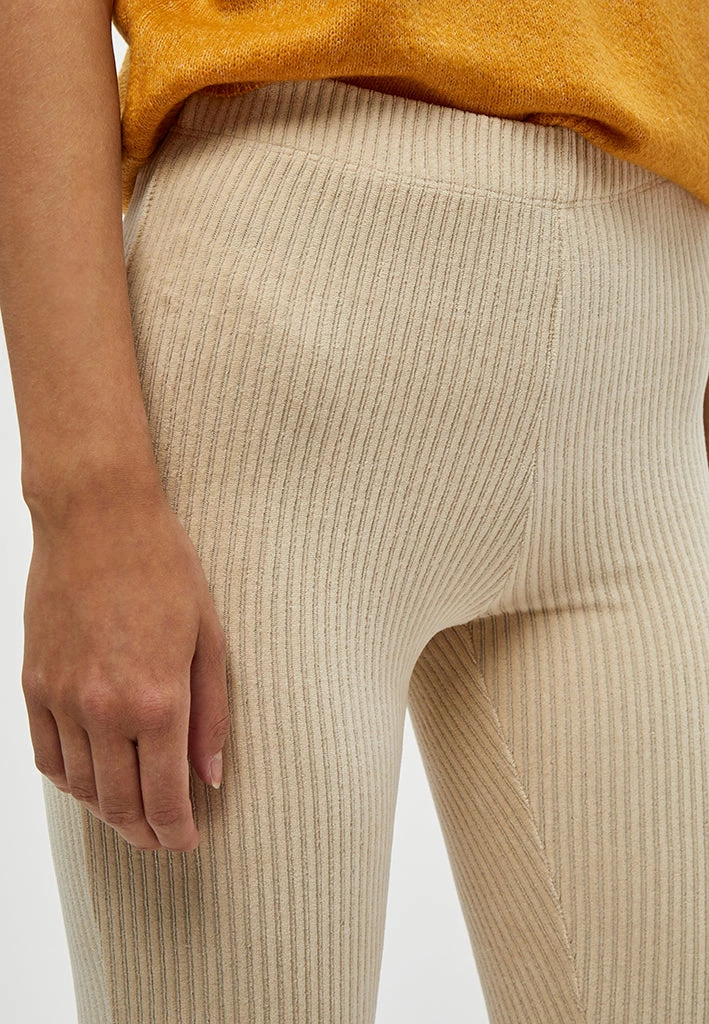 High waisted corduroy pants with an elastic waistband. The pants flare at the bottom and are stretchy.