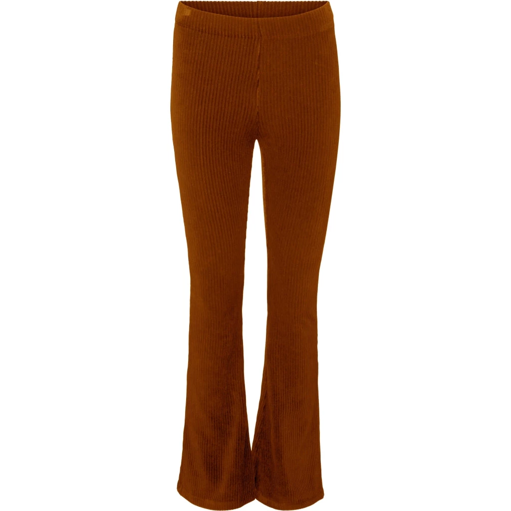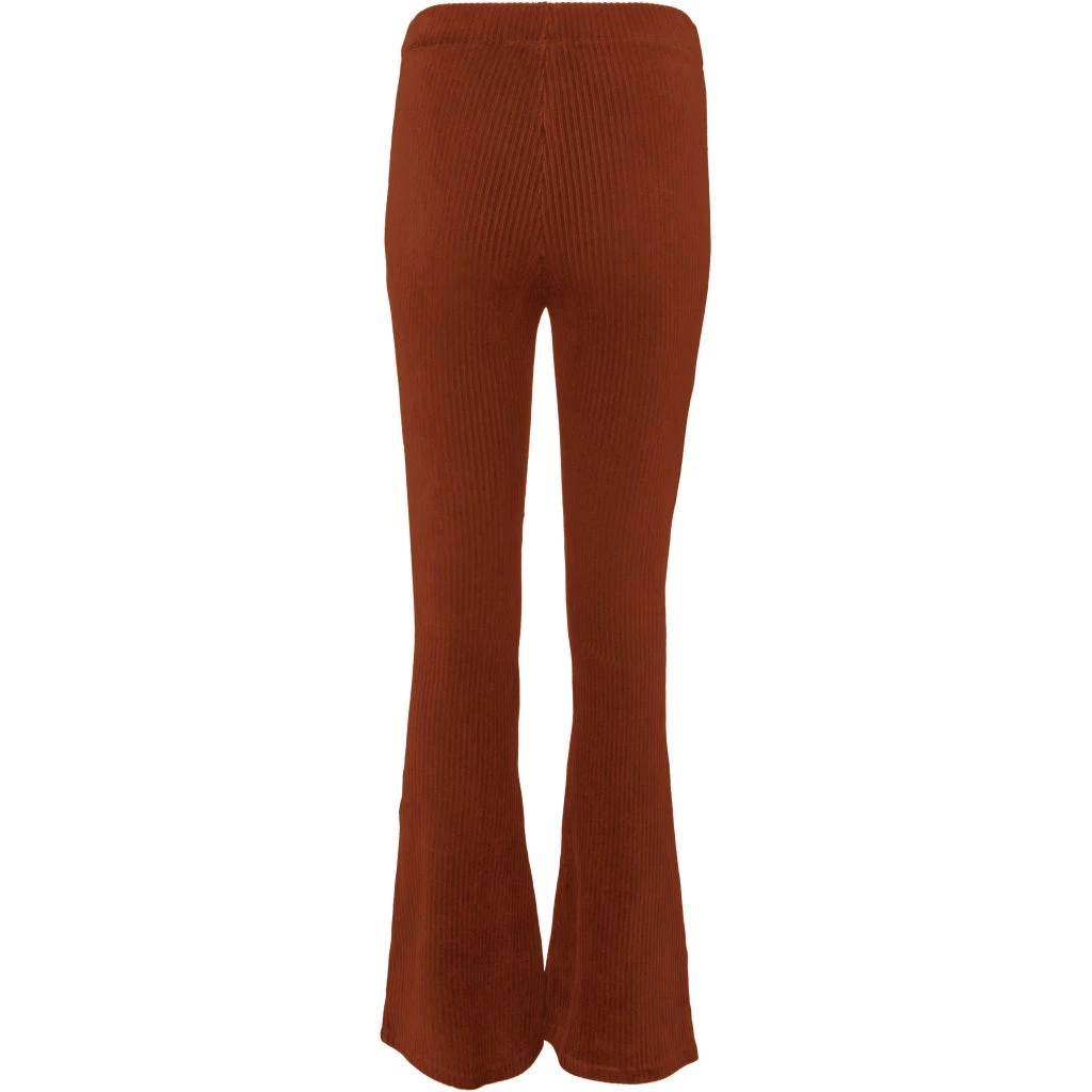 High waisted corduroy pants with an elastic waistband. The pants flare at the bottom and are stretchy.