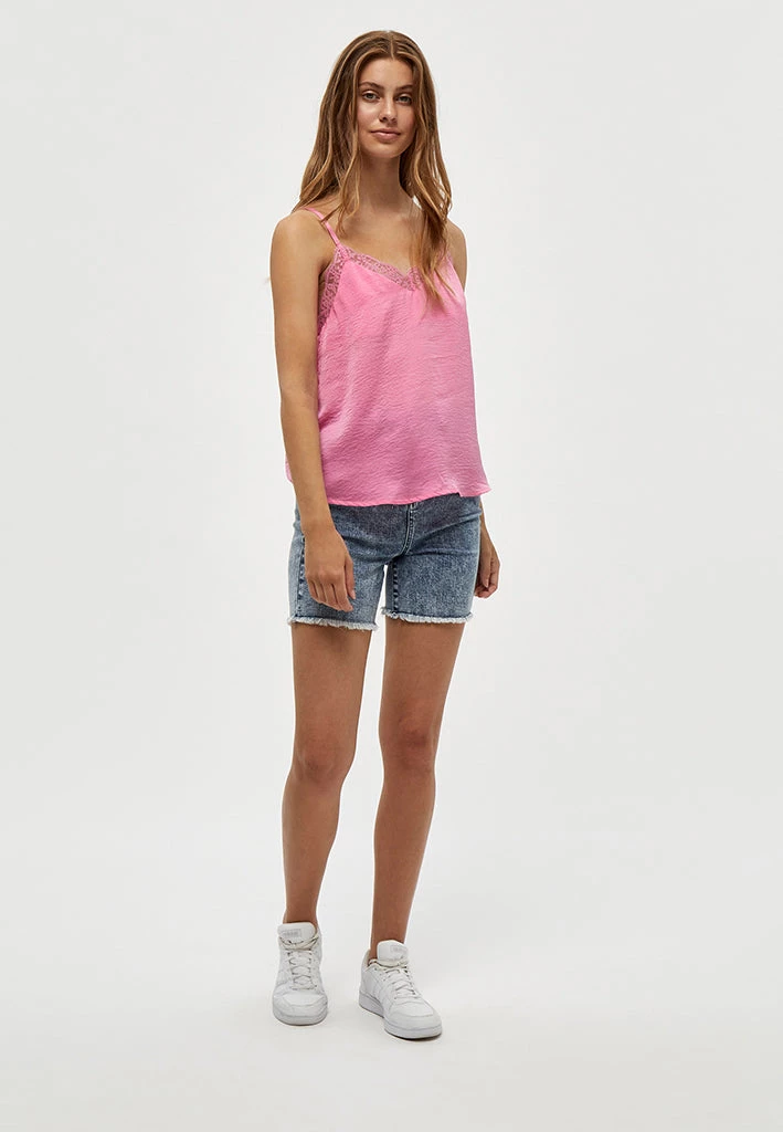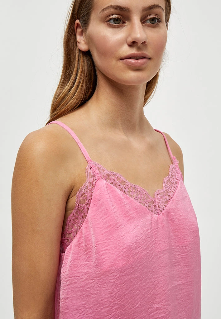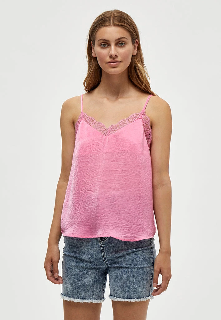 The Cam top is a sleek and elegant top. It has thin straps and a V-neck. The top has lace details at the top giving it a feminin look.