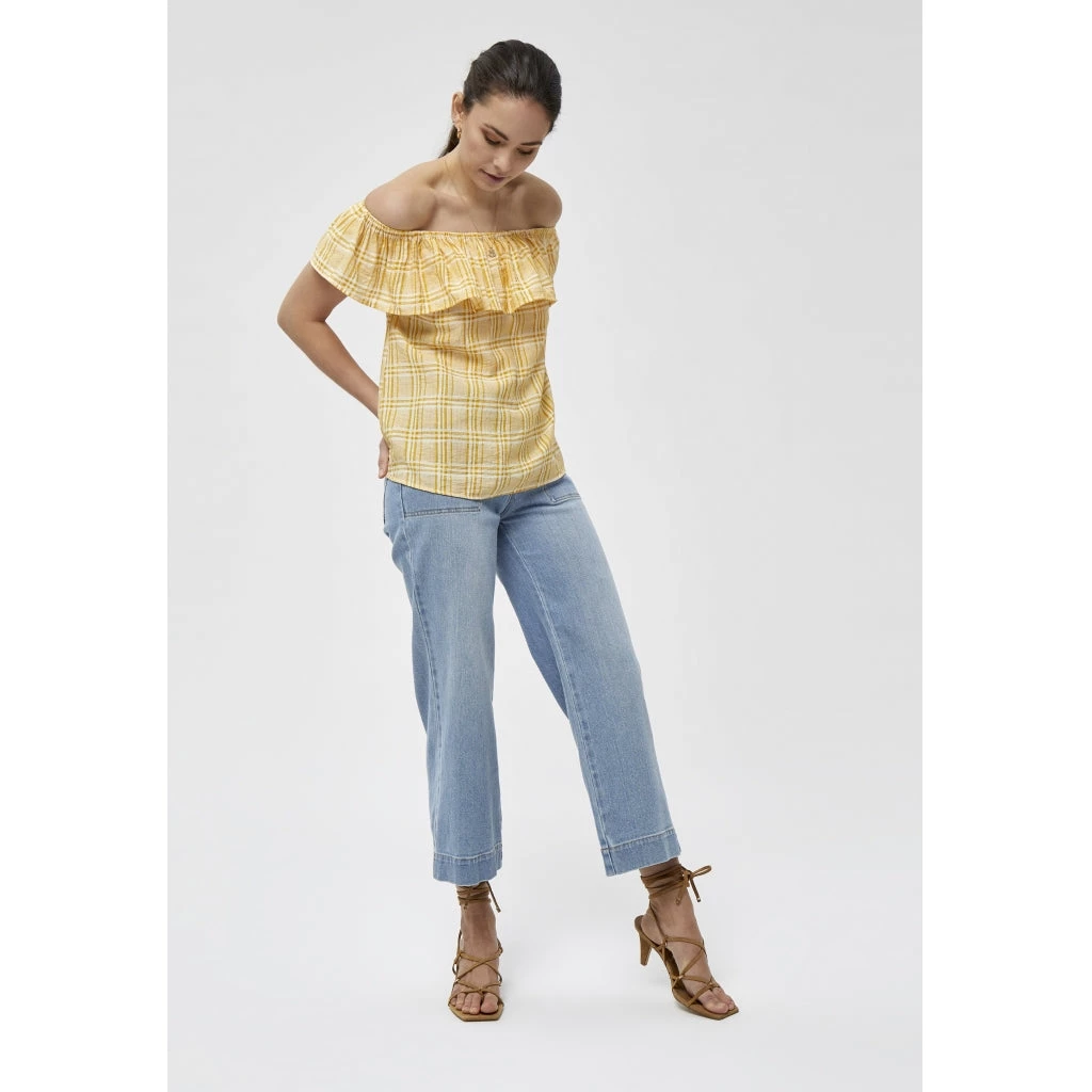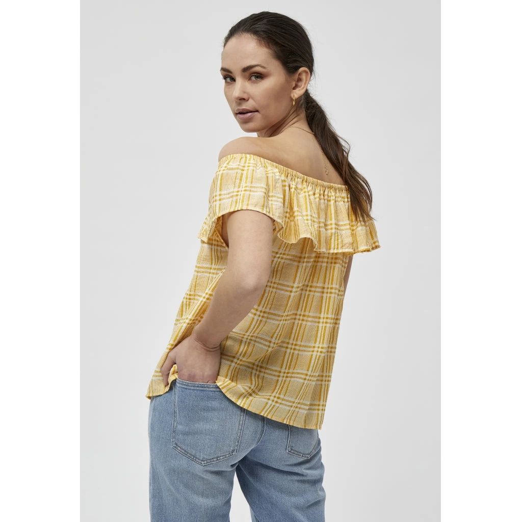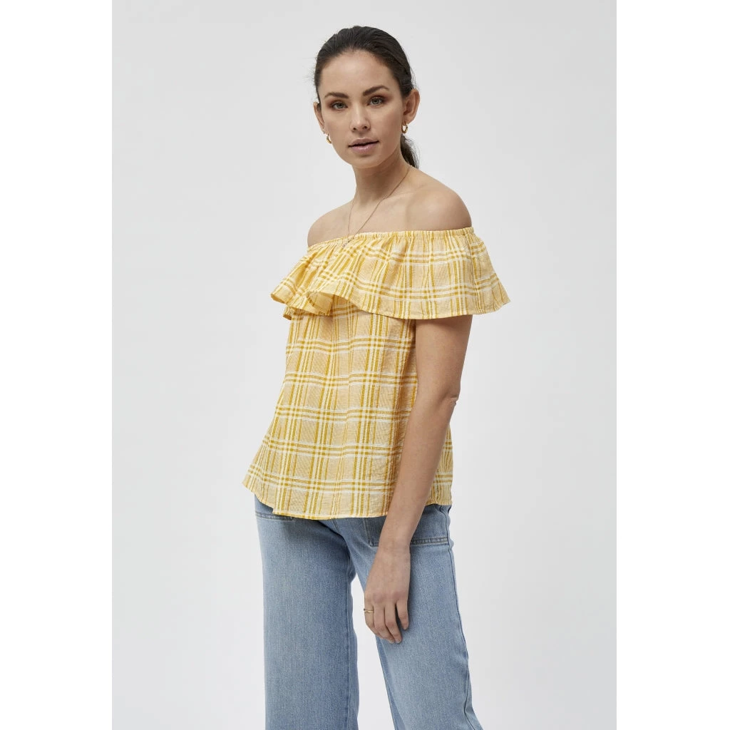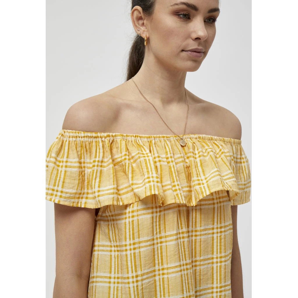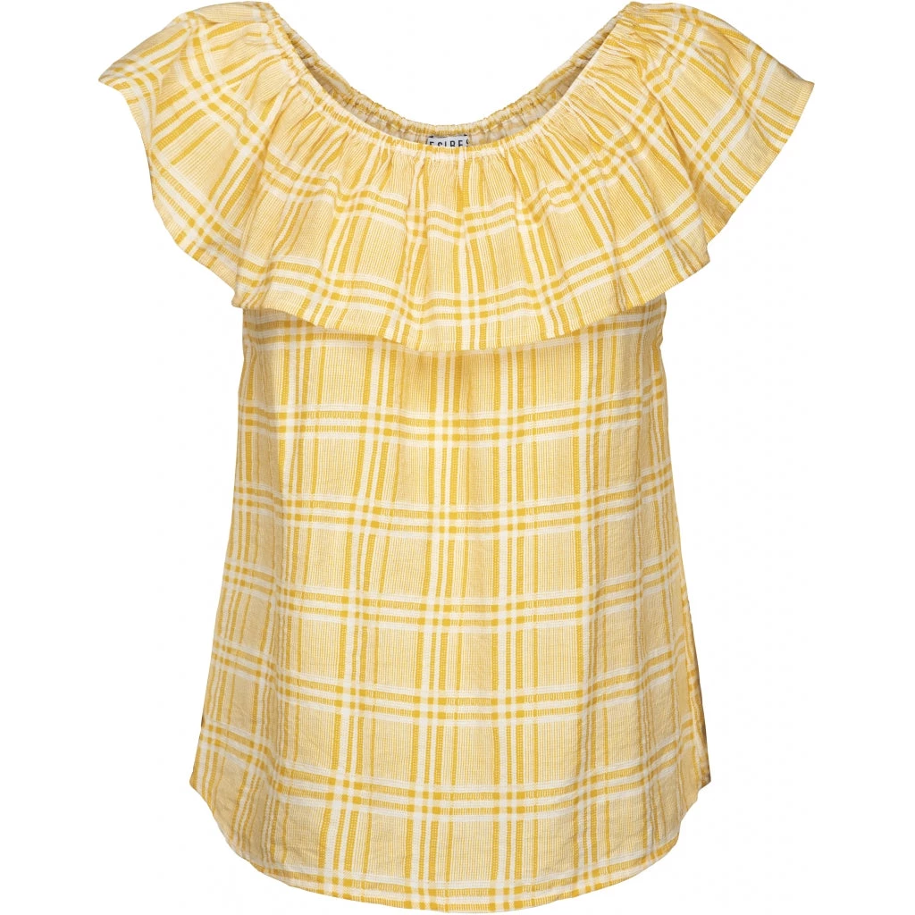 Beautiful off shoulder top with ruffles. The top has a lovely yellow color and a check print.