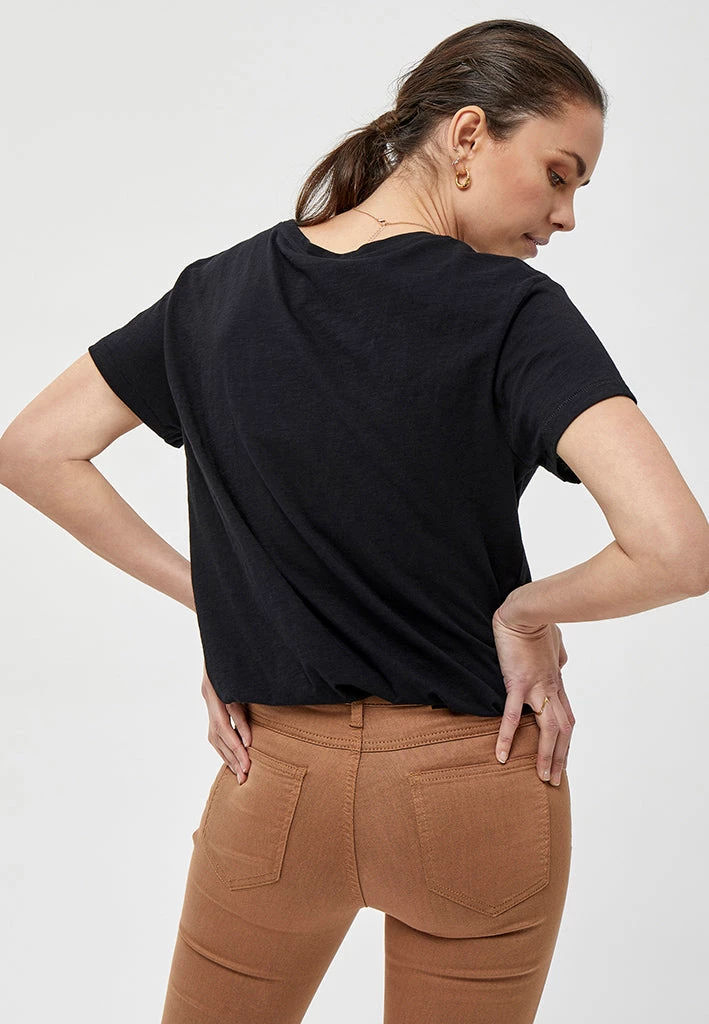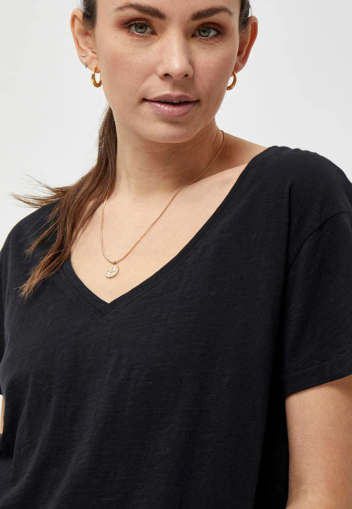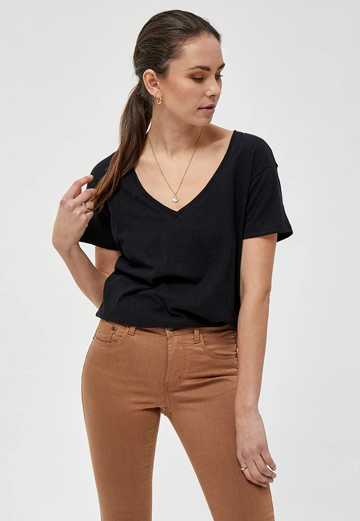 Lovely and simple tee. The tee has a deep v-neckline and short sleeves.