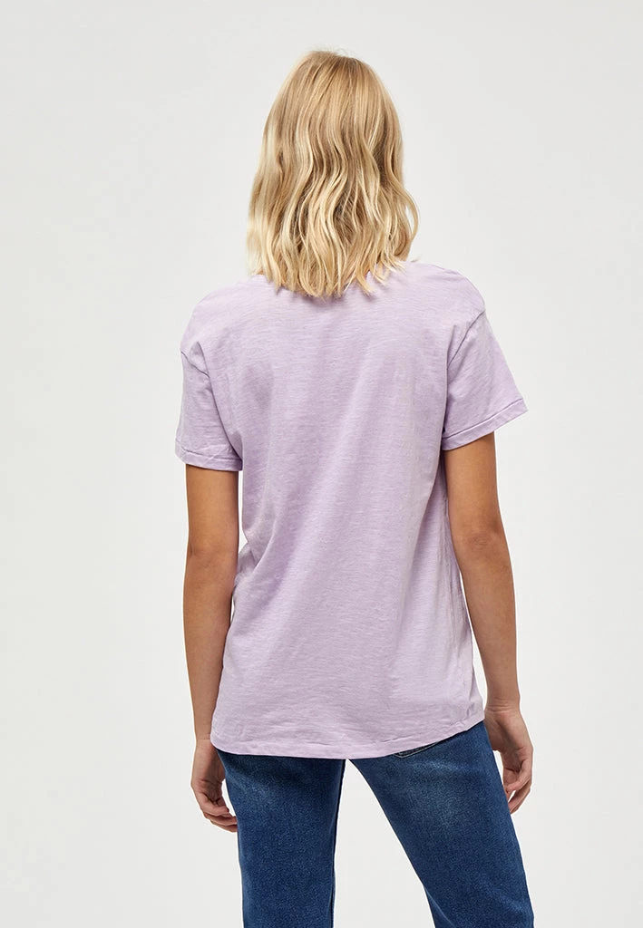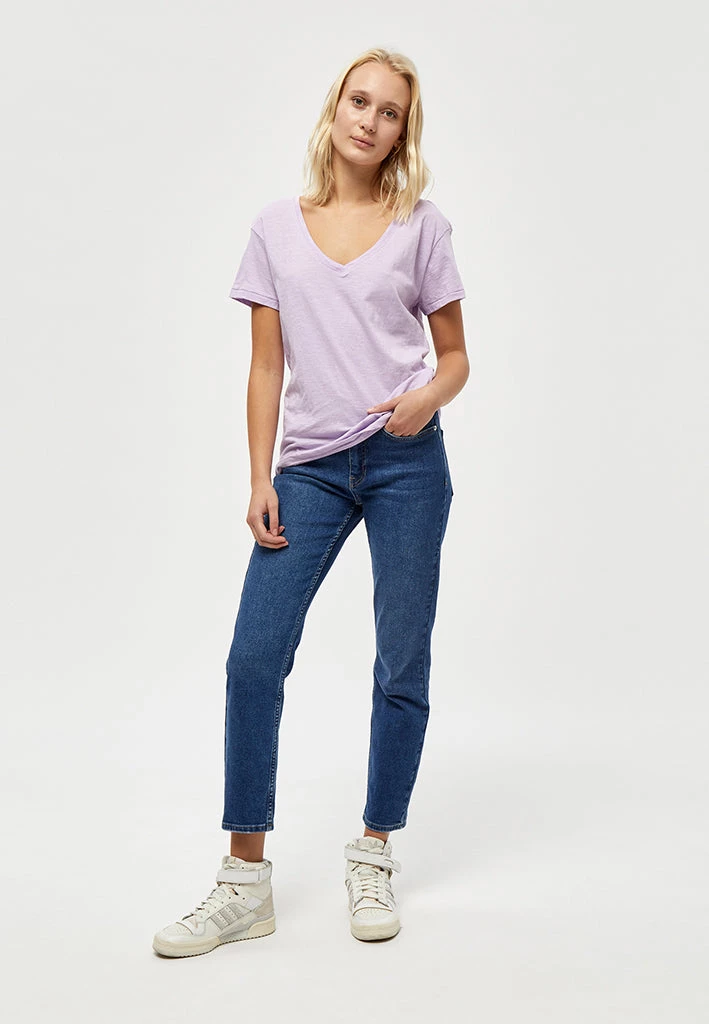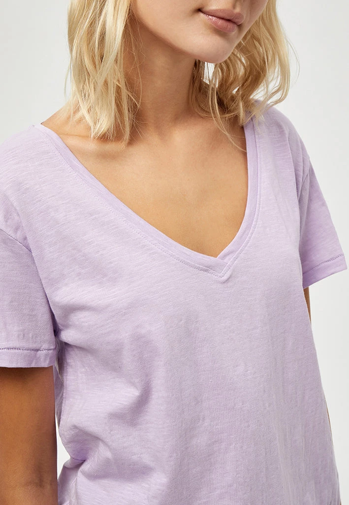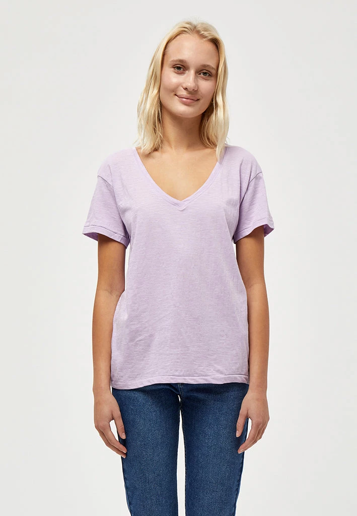 Lovely and simple tee. The tee has a deep v-neckline and short sleeves.