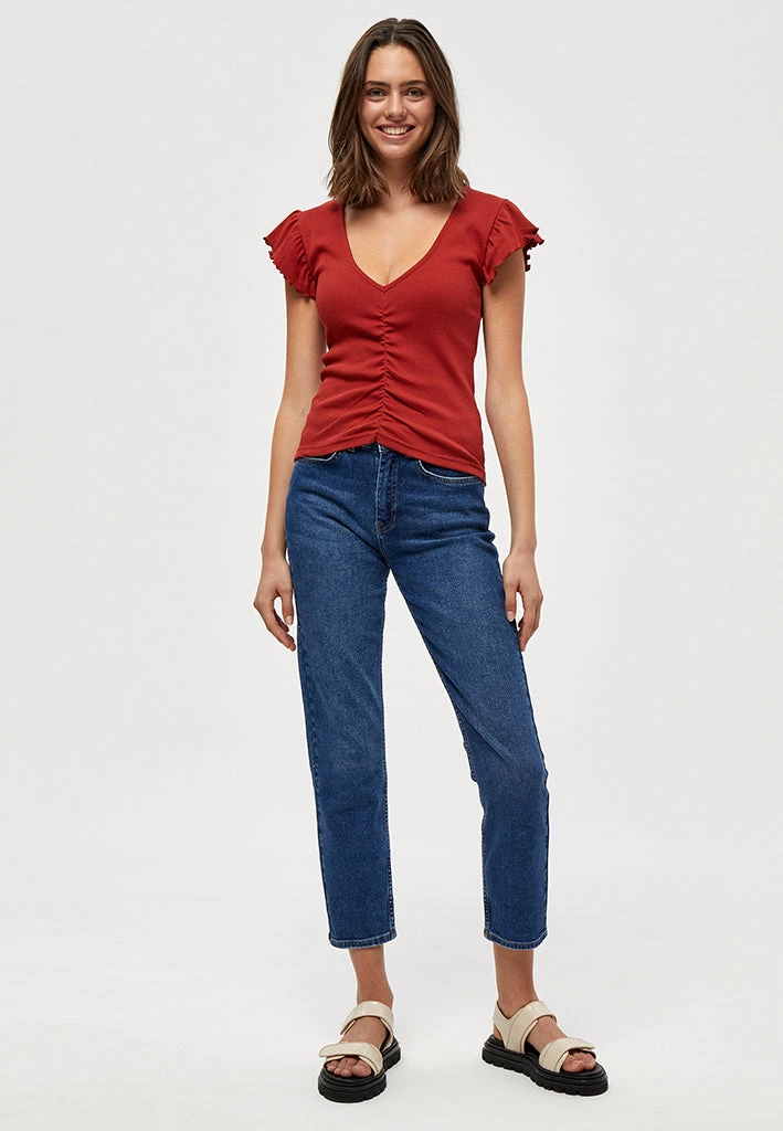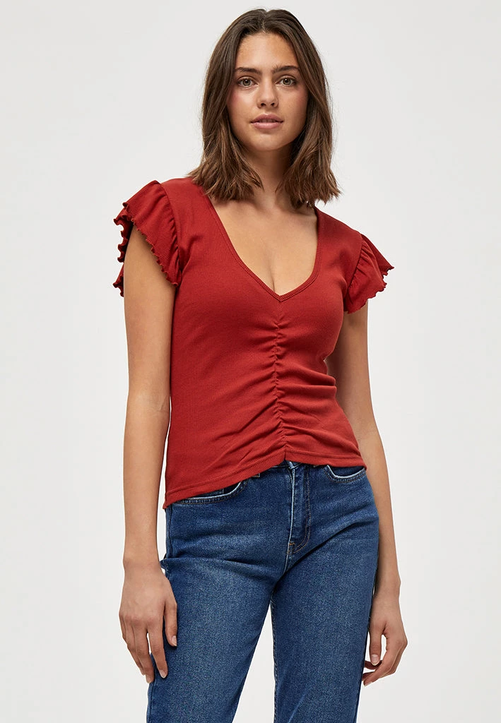 Perfect tee with ruching details and ruffles on the sleeves. The deep v-neck adds a very pretty feminin touch. The tee is made from 95% organic cotton which makes it a sustainable choice.