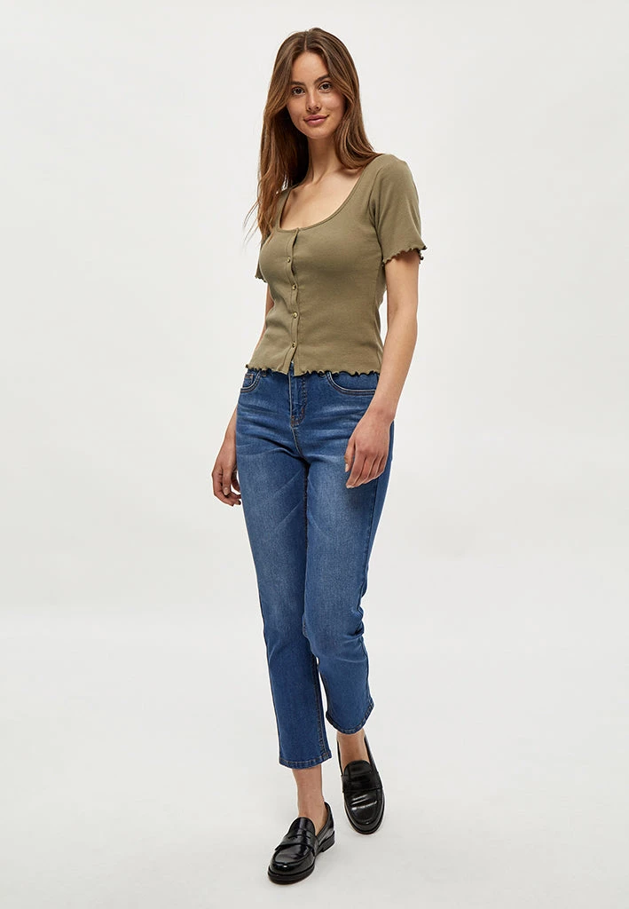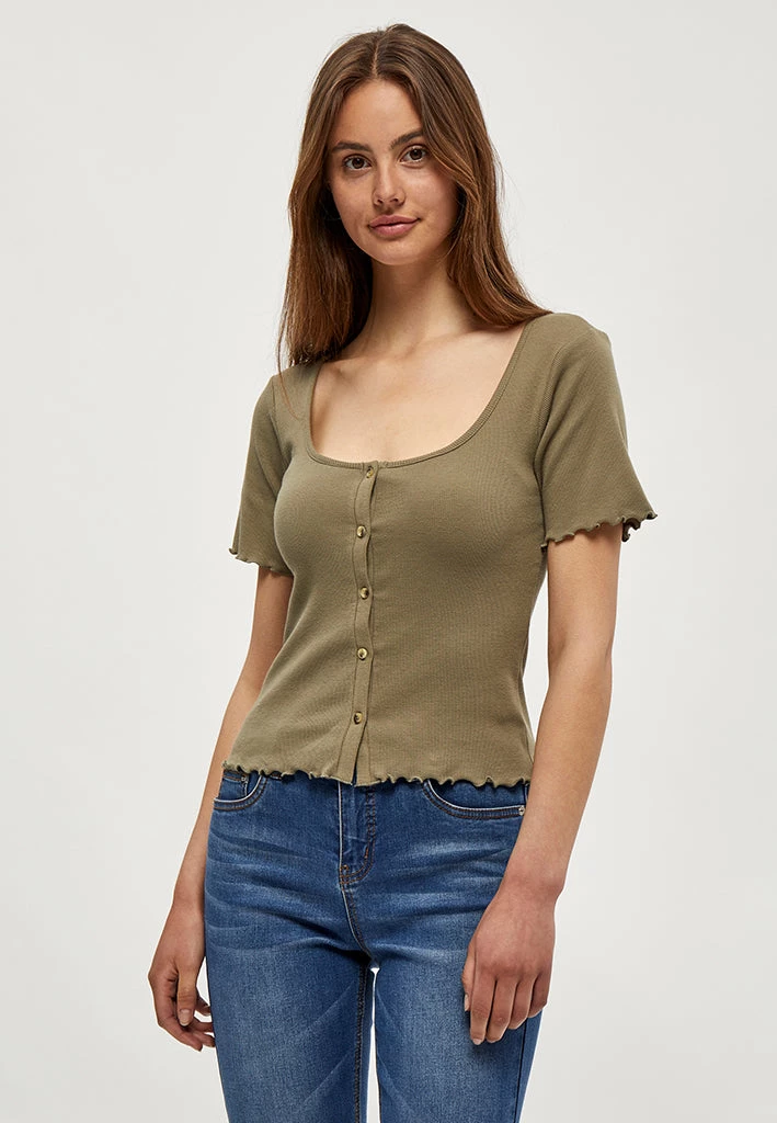 Lovely tee with butons down front. The tee has wavy edges at the bottom of the sleeves and at the bottom of the tee.