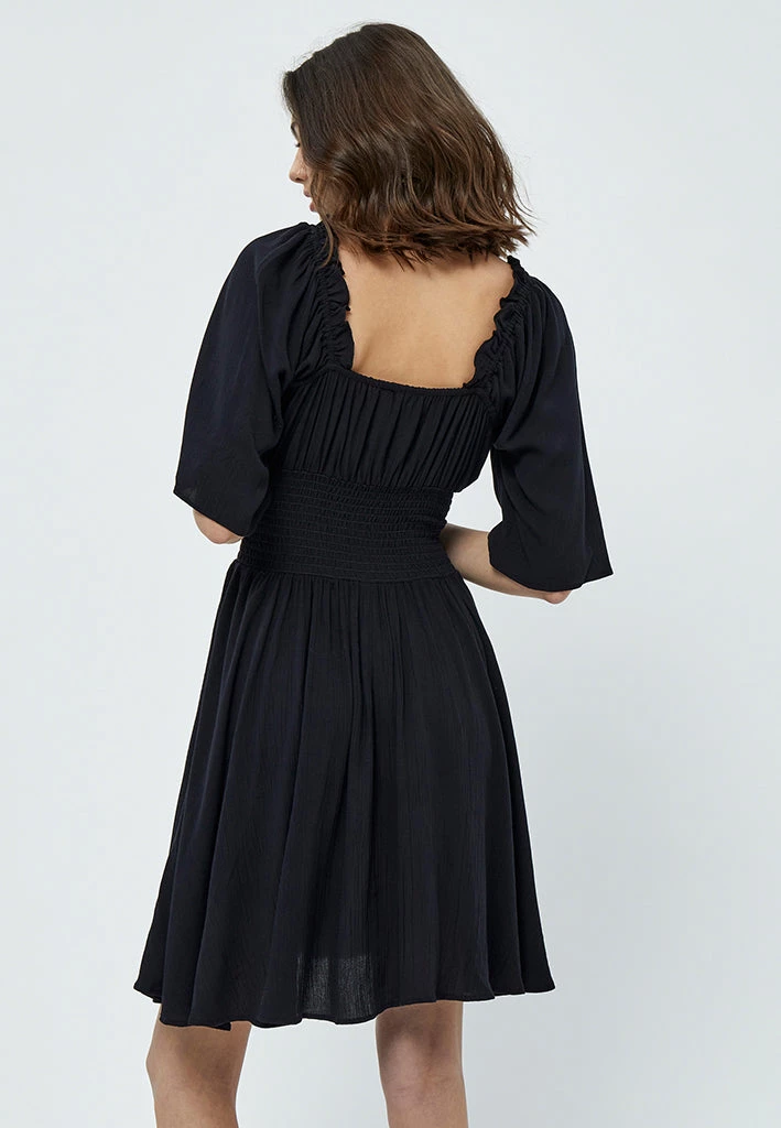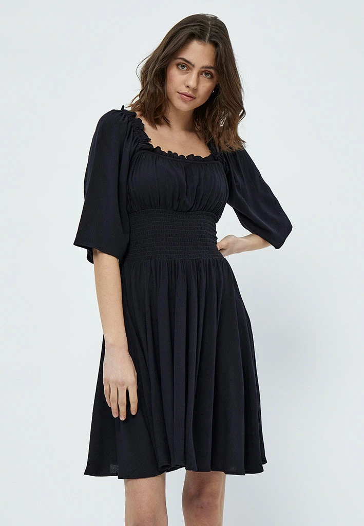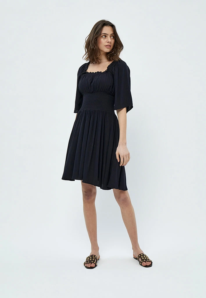 The perfect flowy dress with smock details at the waist and ruffles around the square neckline.