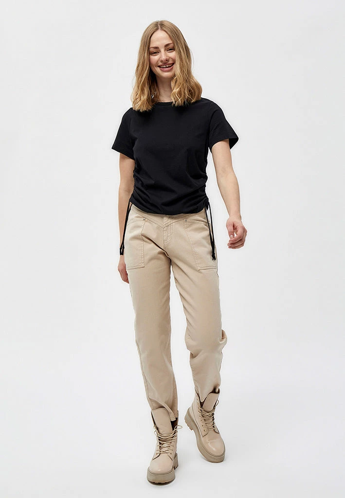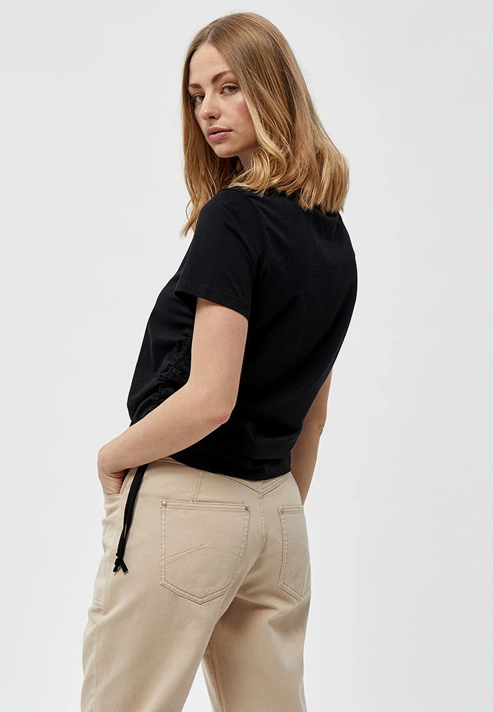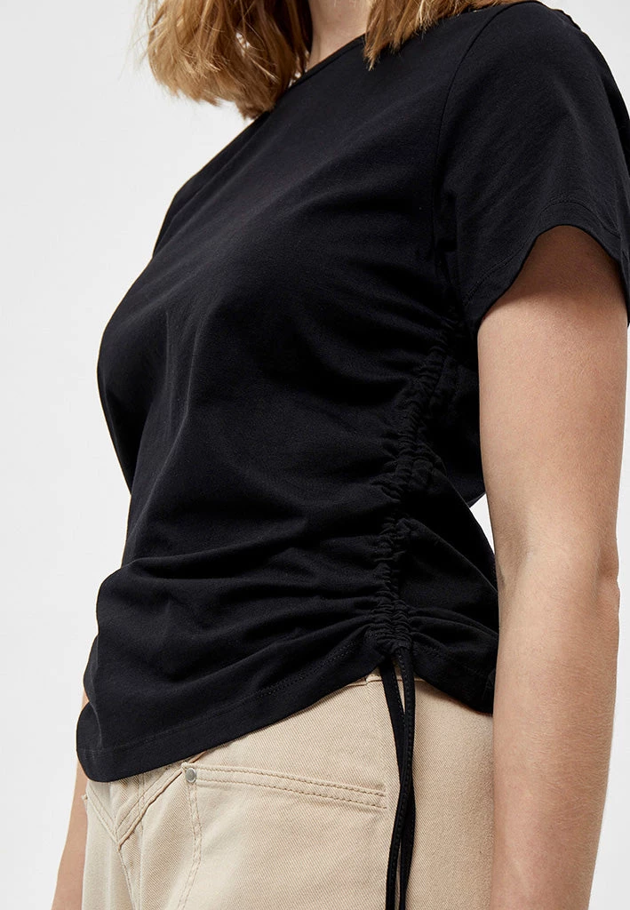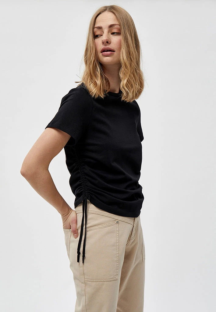 Cool and fashionable Tee. The tee is ruched at the sides with drawstring details. It is easy to style with other items.