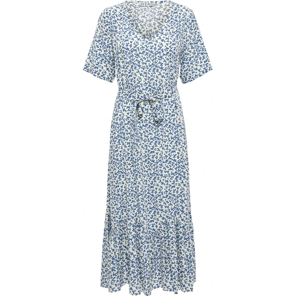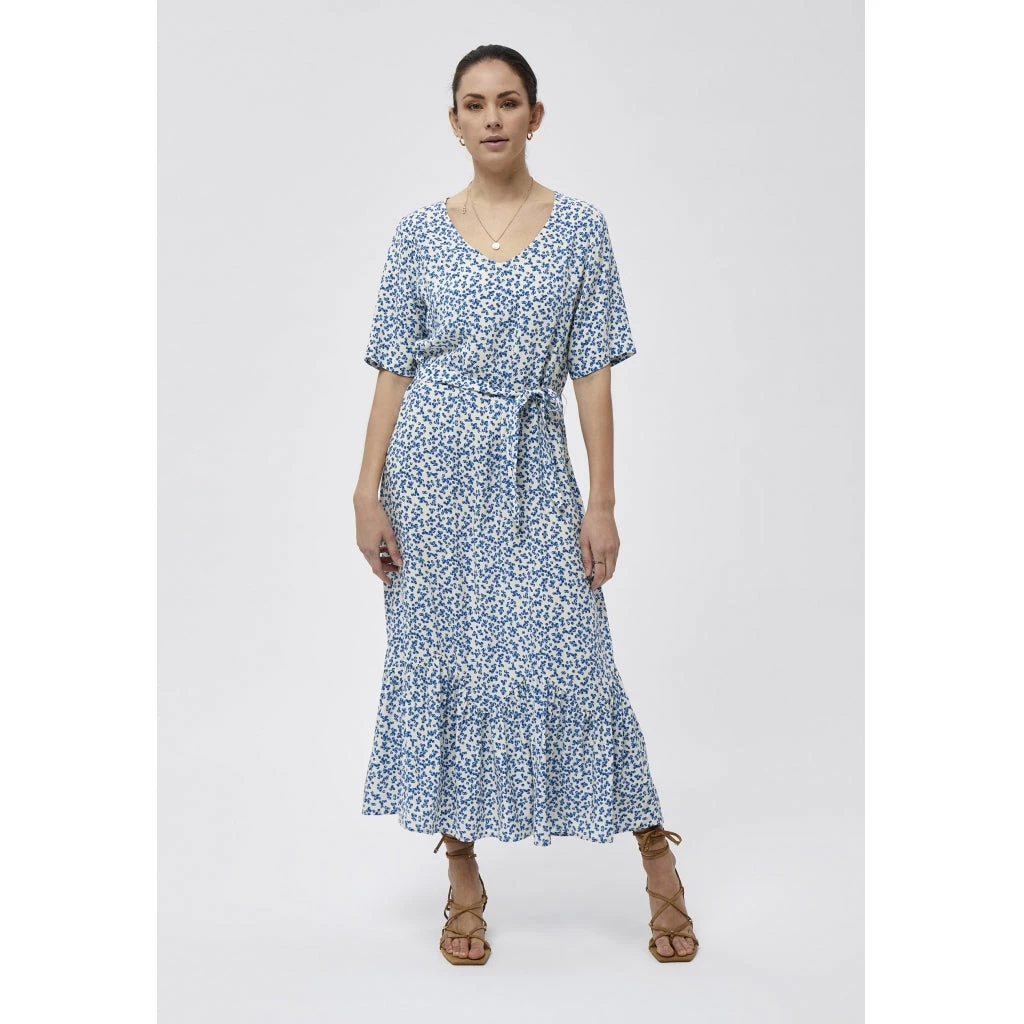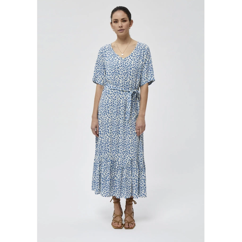 Long and beautiful dress with the nicest print. The dress has a round neck, short sleeves and ruffles at the bottom. It has a belt to tie at the waist.