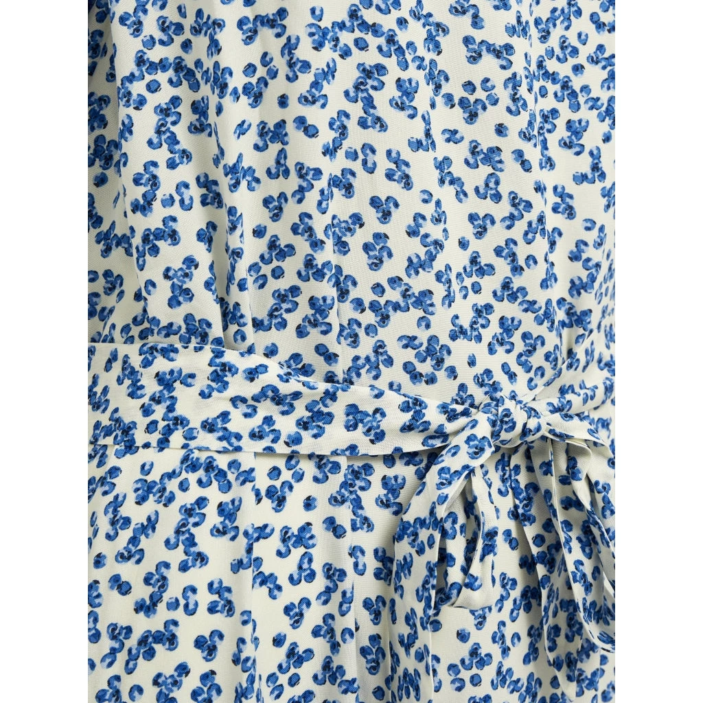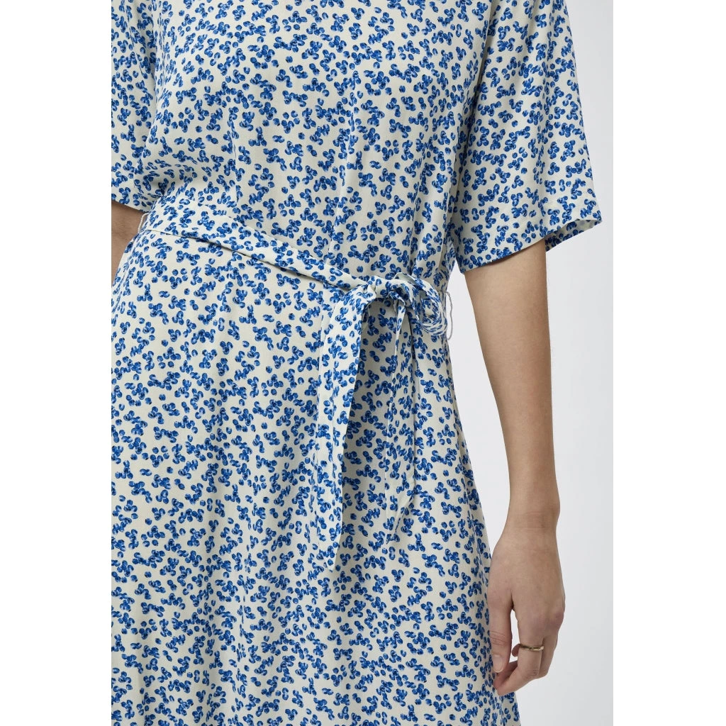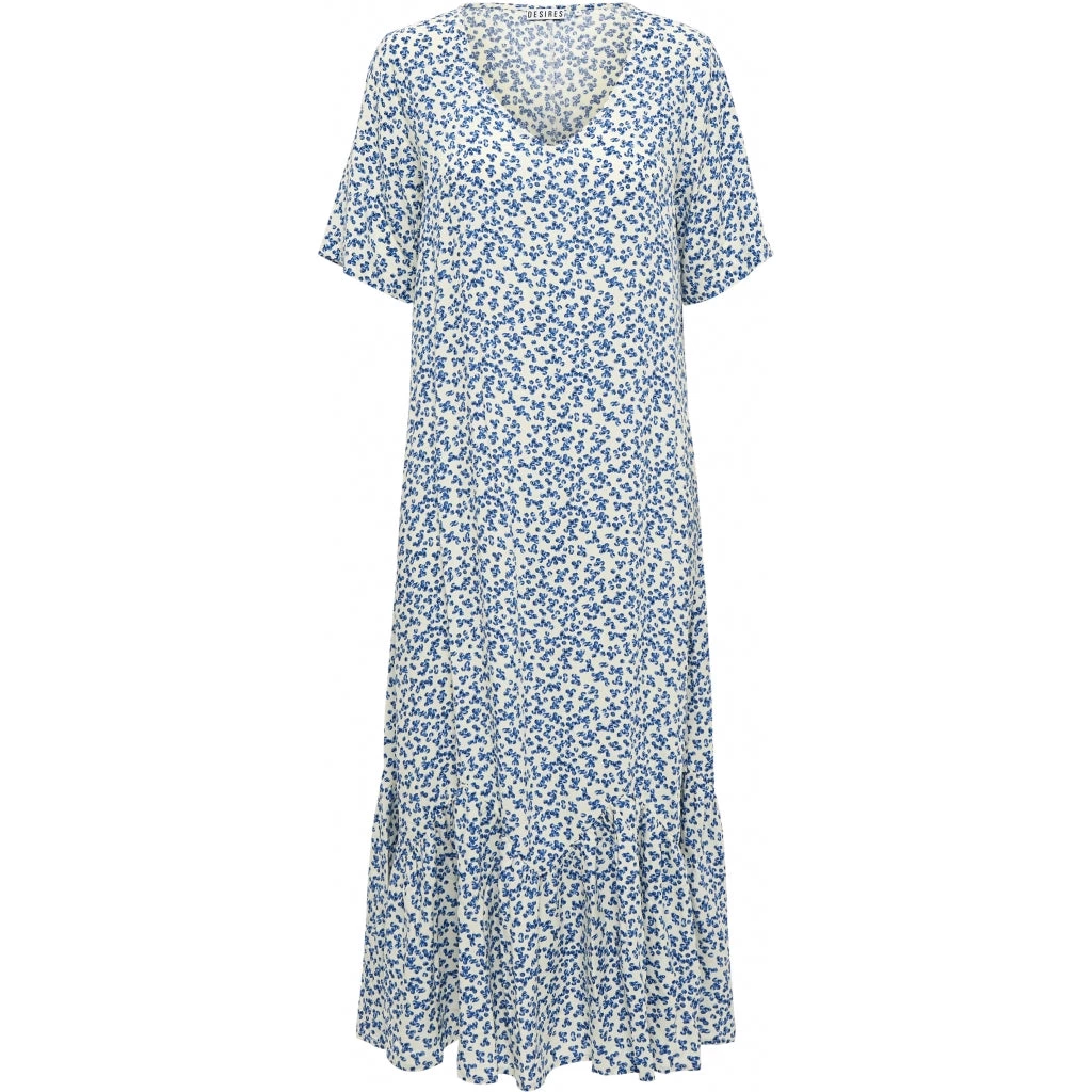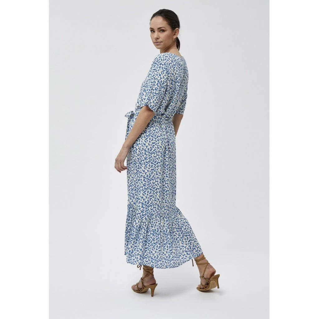 Long and beautiful dress with the nicest print. The dress has a round neck, short sleeves and ruffles at the bottom. It has a belt to tie at the waist.