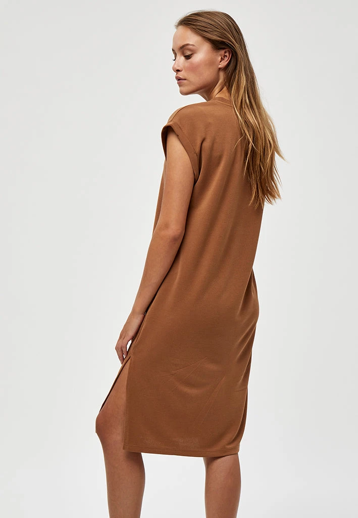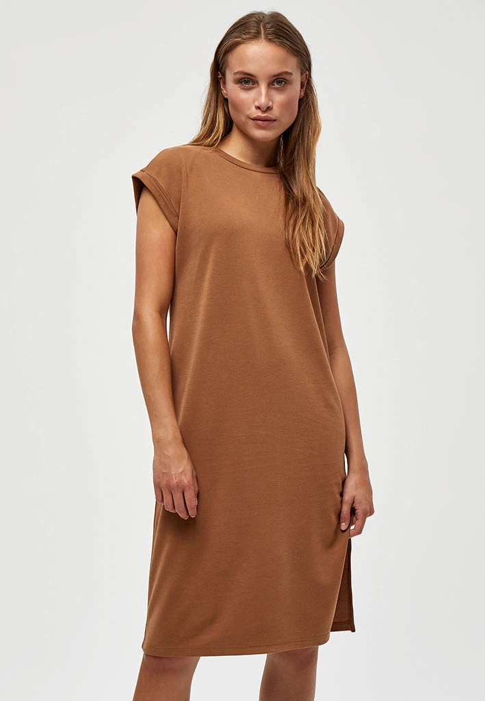 Lovely and comfortable dress. The dress has a round neck and short sleeves. The sleeves ae folded up. The dress has a slit at the side.