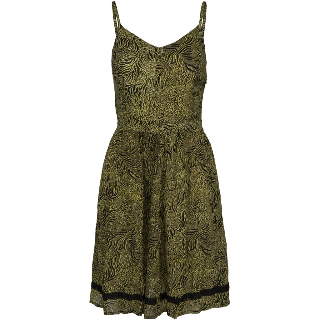 The Fenja dress has thin straps and a loose fitting skirt. The dress has buttons down the front which is a nice added detail to the otherwise simple silhouette. The black print and neon accents look great with the green colour of the dress.