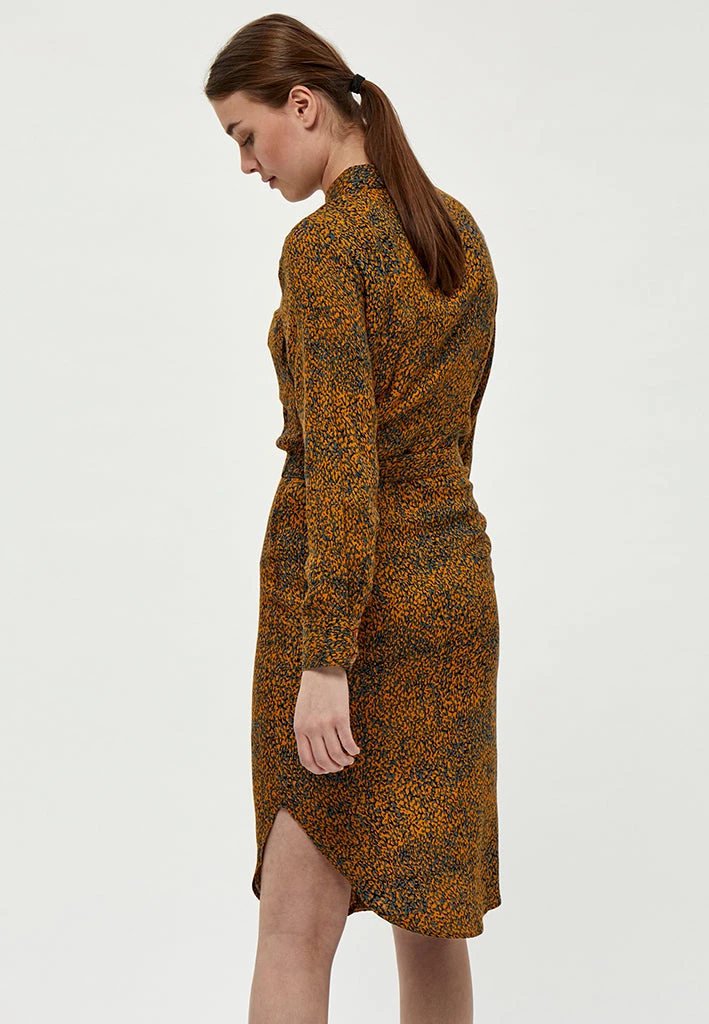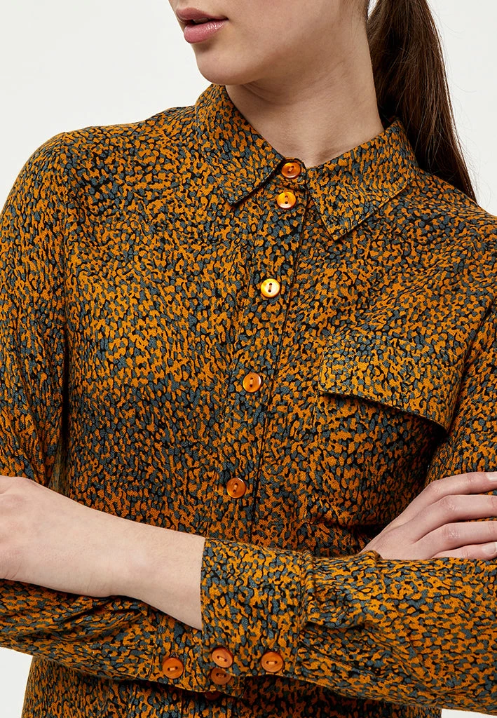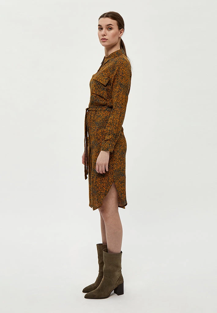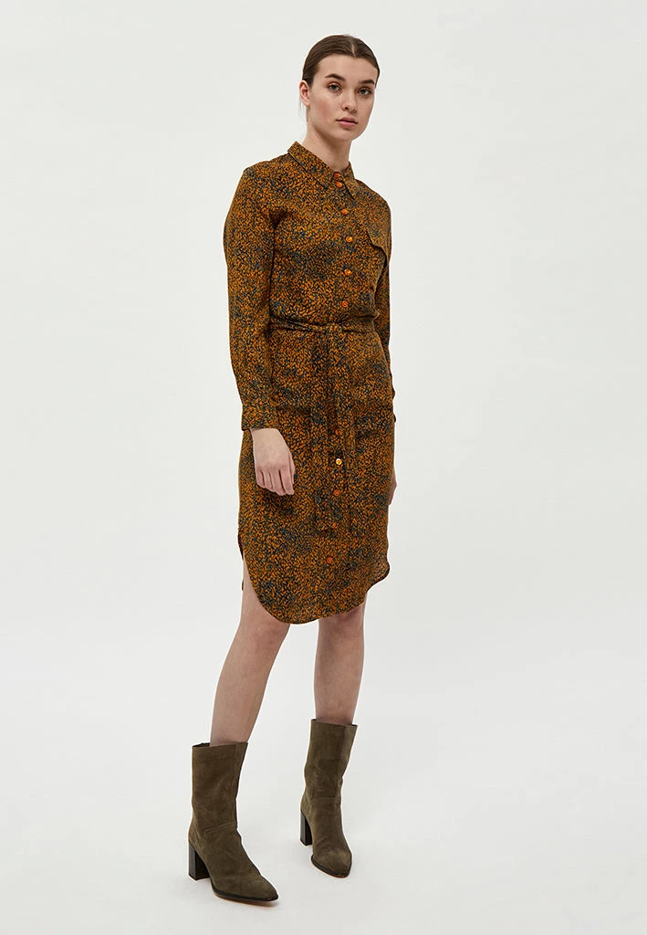 Lovely shirt dress with a beautiful print. The dress has a collar, a chest pocket and a belt you can tie at the waist. It is closed by buttons.