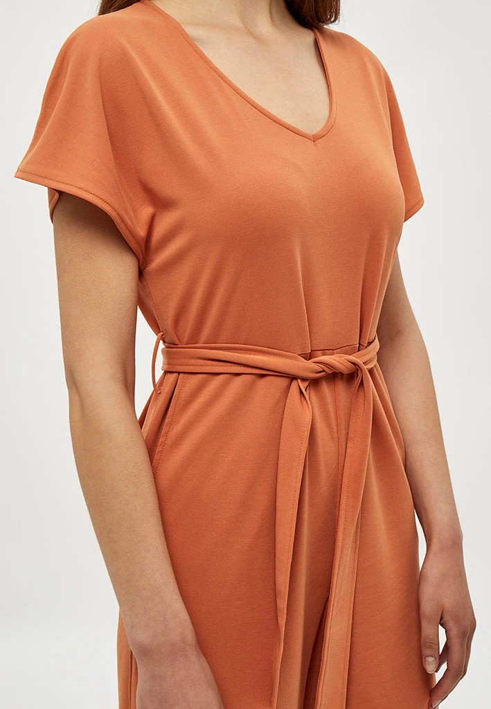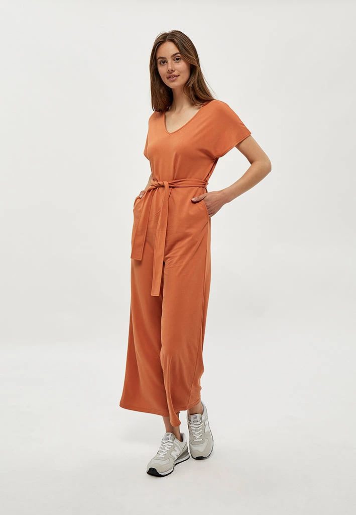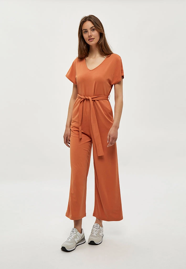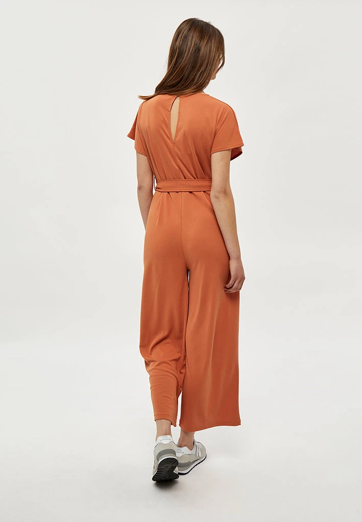 Lovely jumpsuit with short sleeves. The jumpsuit is closed at the back of the neck. It has a tieable belt at the waist.