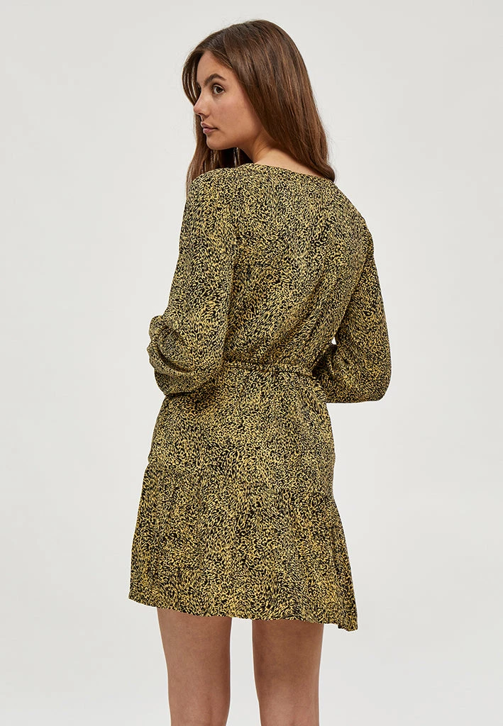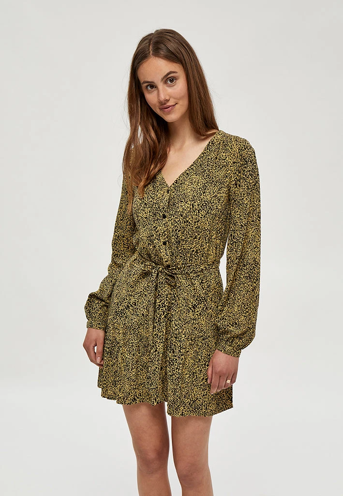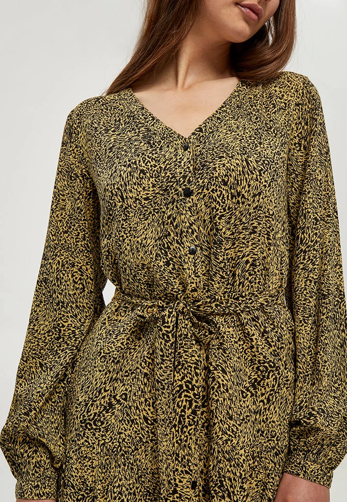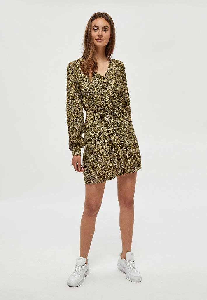 Beautiful dress with a v-neck. The dress is closed by buttons and has a tieable belt in the waist. It has long sleeves and is perfect for spring.