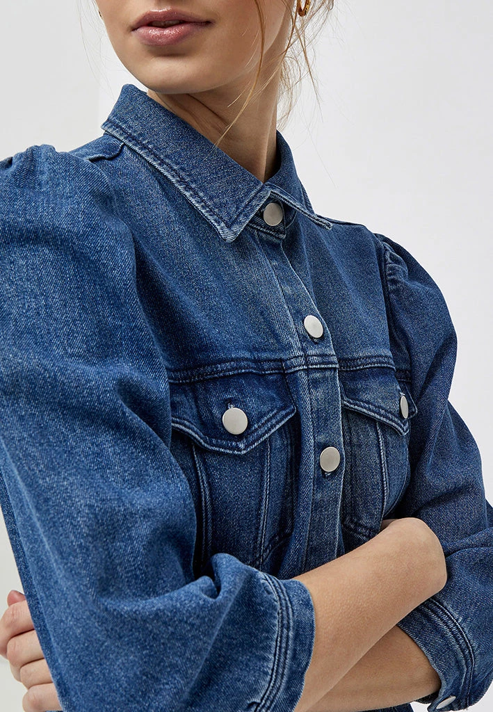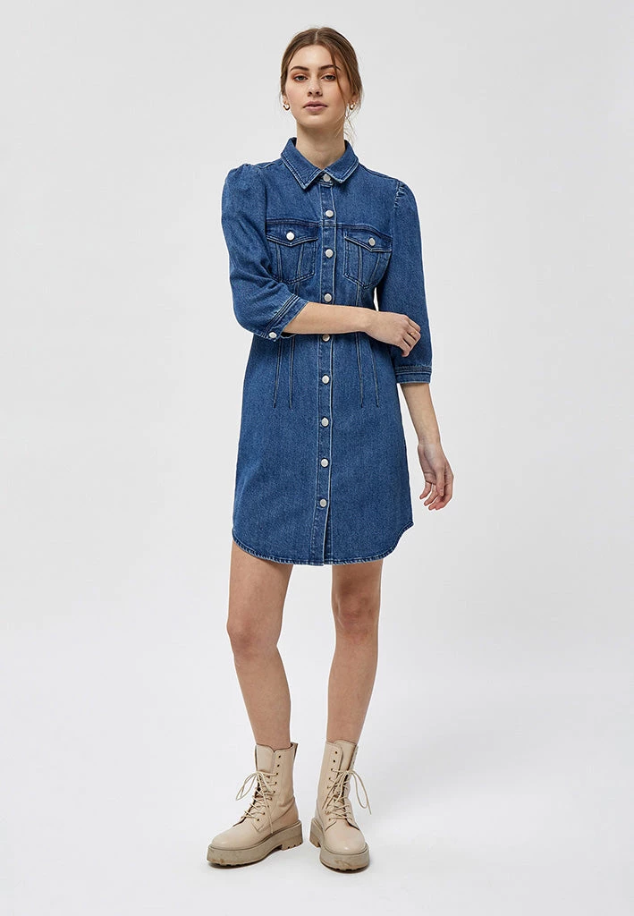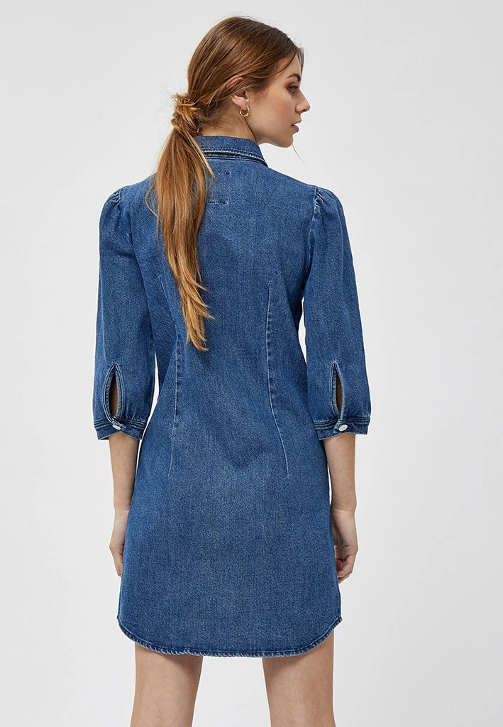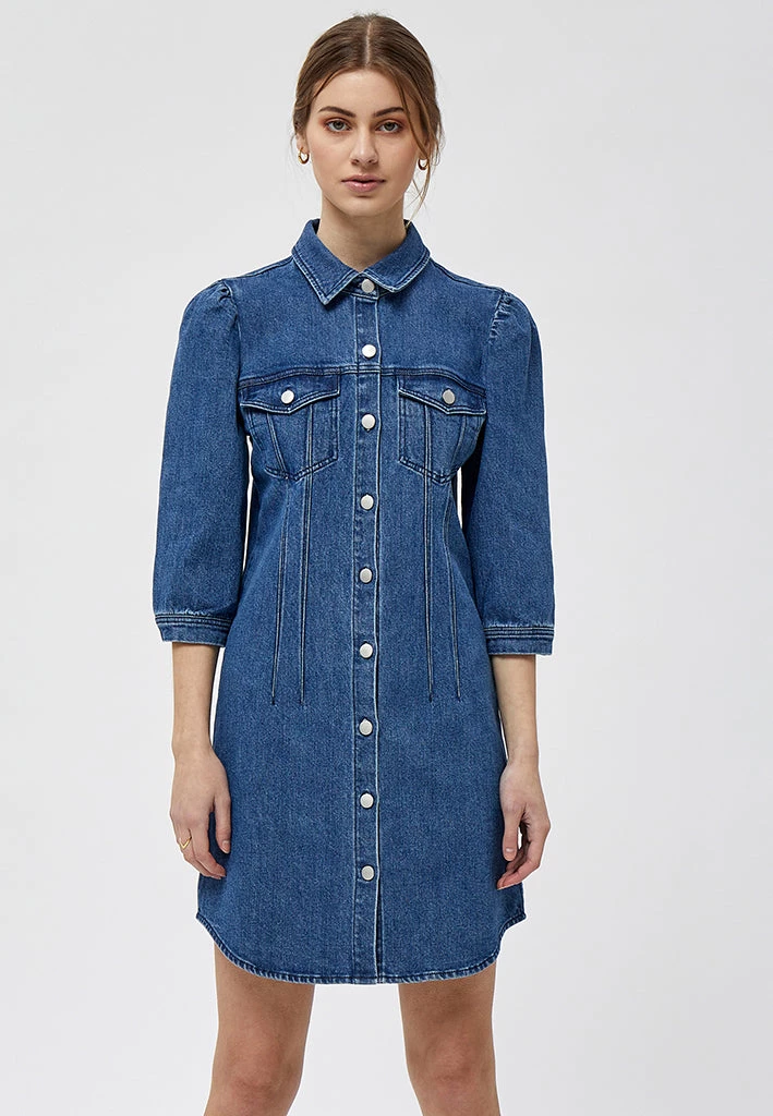 Cool denim dress with 3/4 sleeves. The dress has chest pockets and a collar. It is closed by buttons.