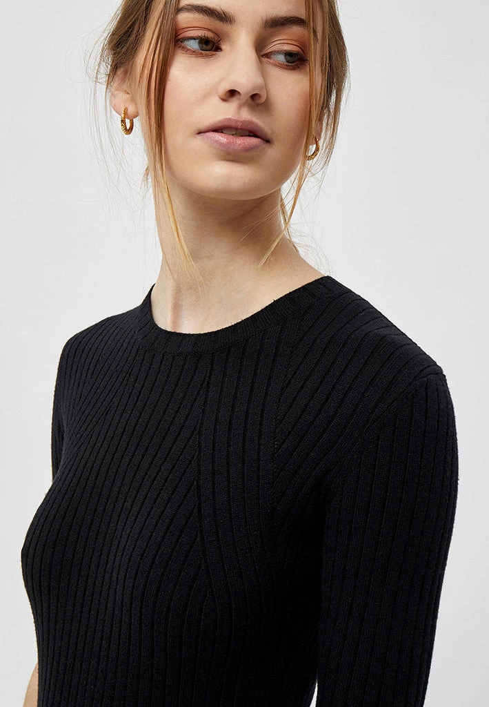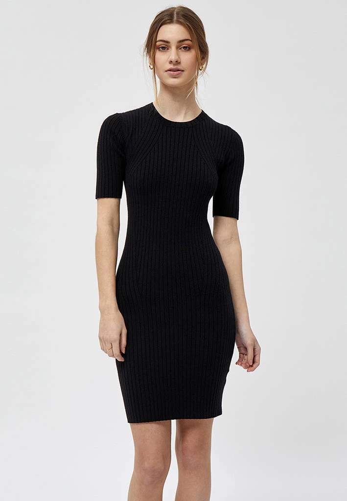 Beautiful tightly fitted dress. The dress has short sleeves and a round neck. The dress has rib.