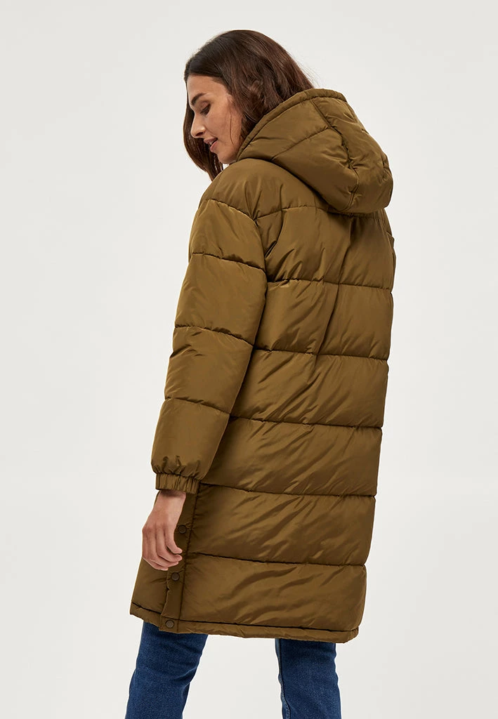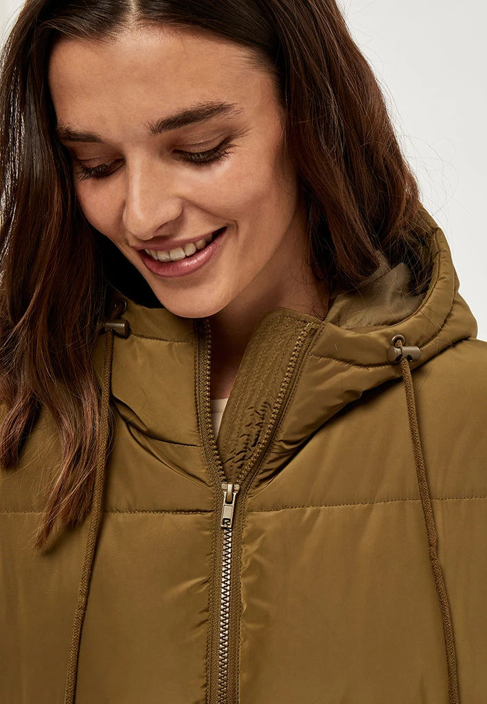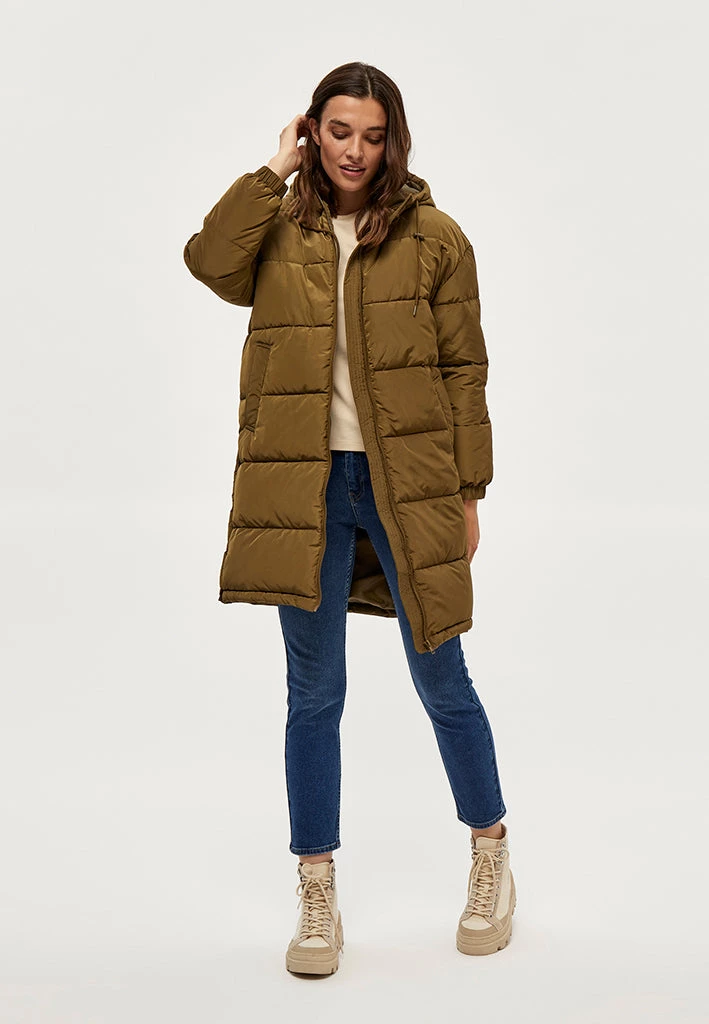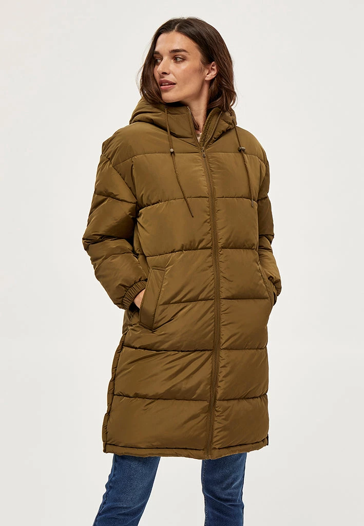 Long and comfortable jacket. The jacket has side pockets, a hood and is closed by a zipper.