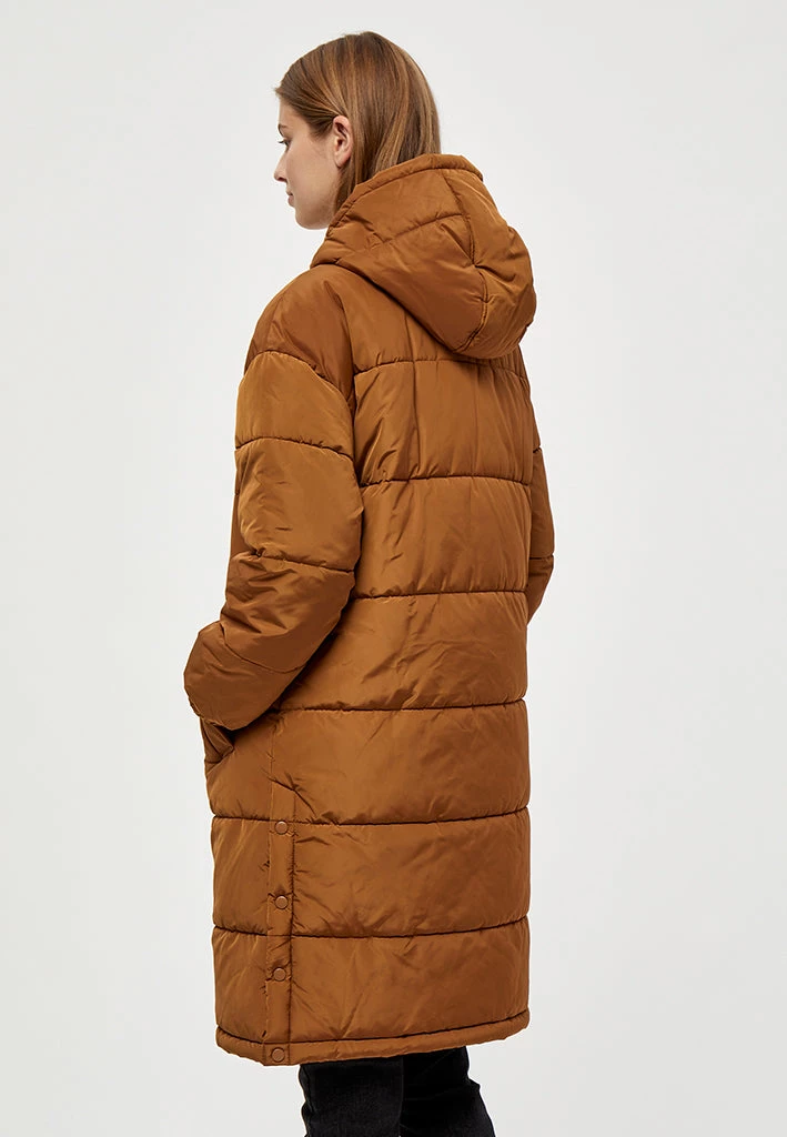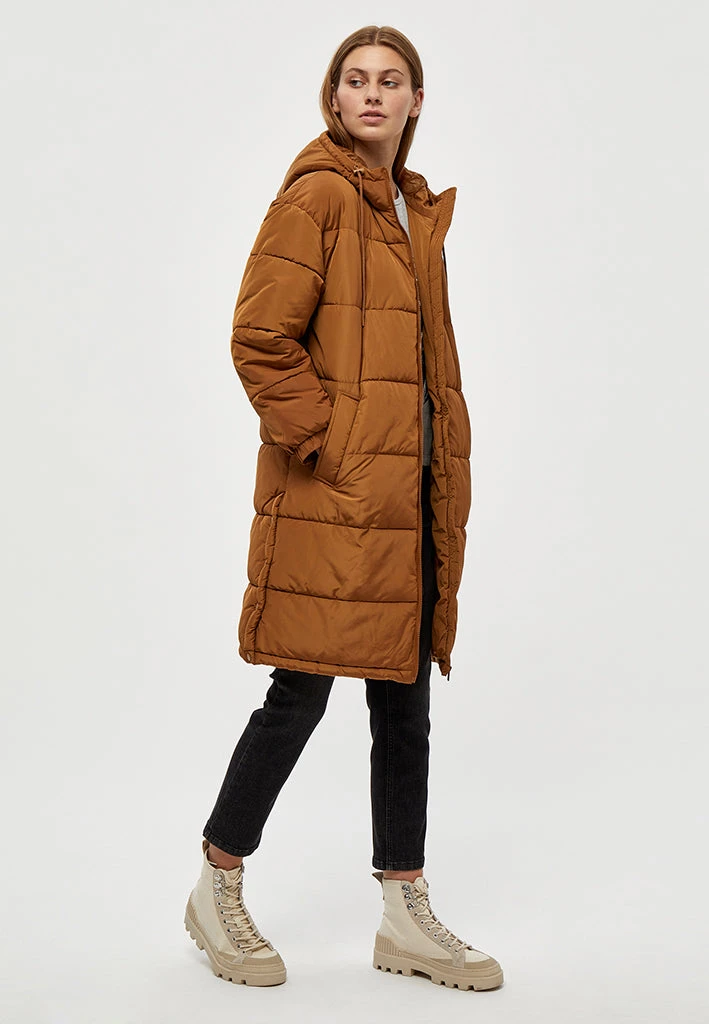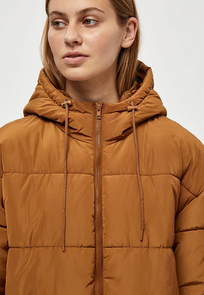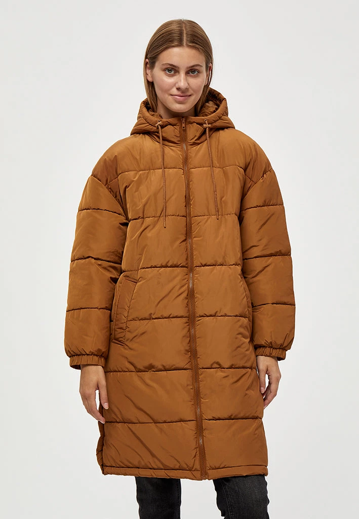 Long and comfortable jacket. The jacket has side pockets, a hood and is closed by a zipper.