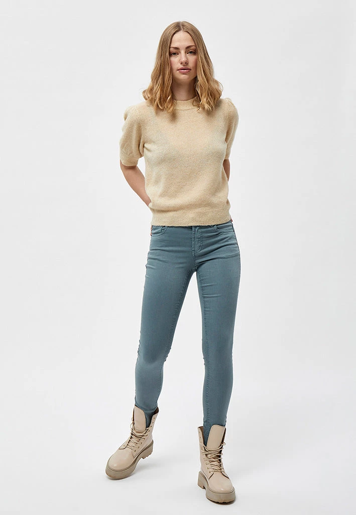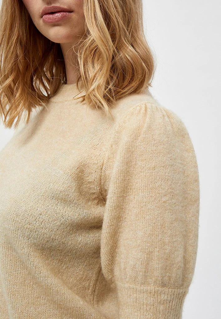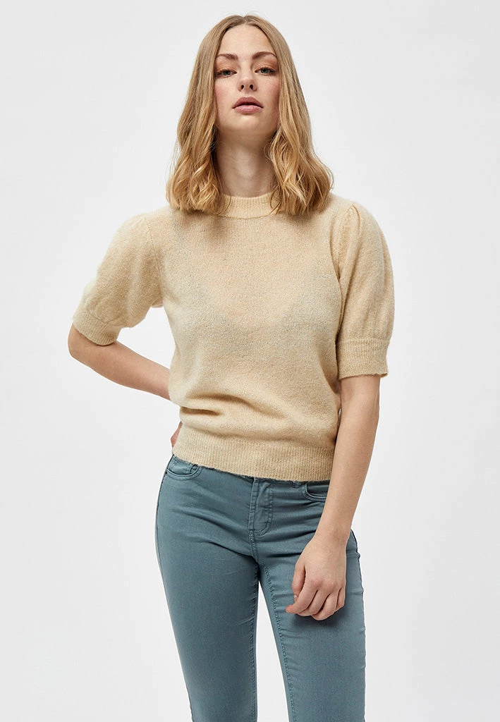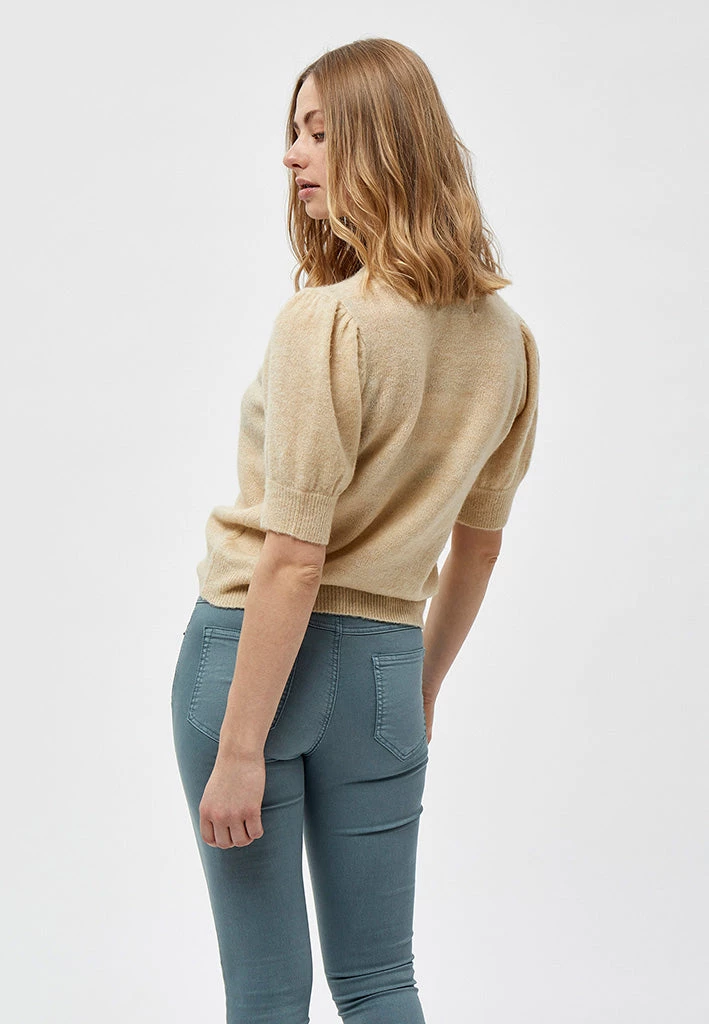 Lovely knit tee. The tee has slightly puf sleeves. It has rib at the edges. Easy to style with a pair of jeans or a pair of pants.