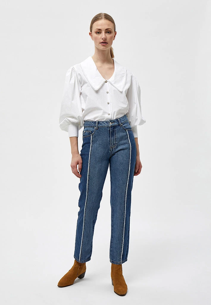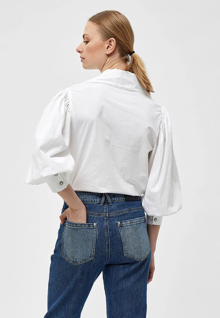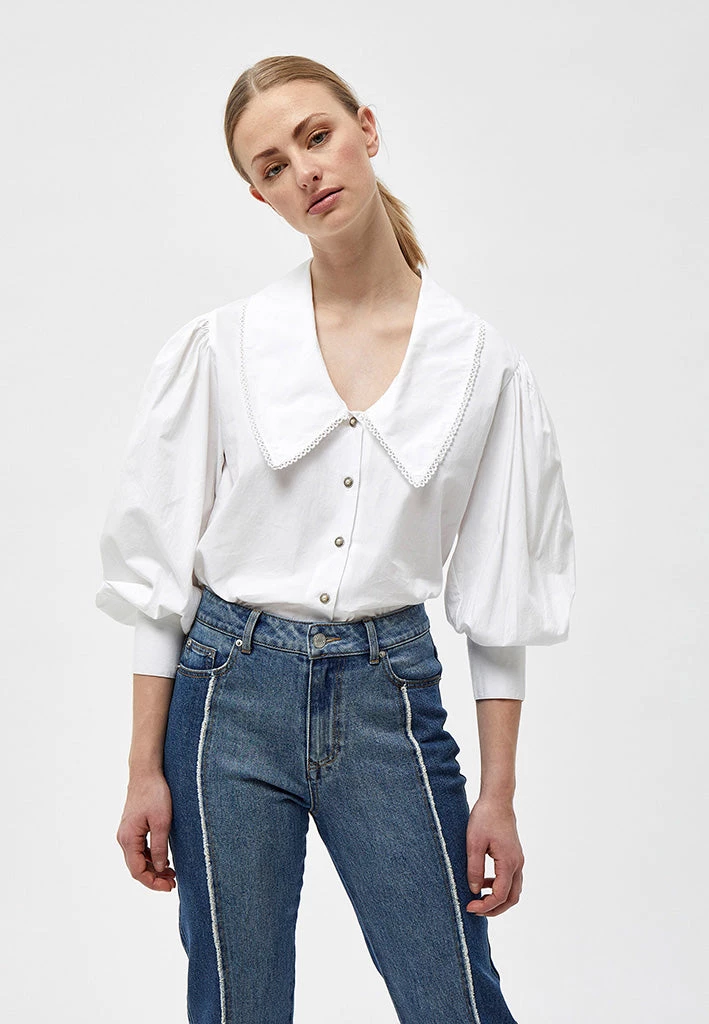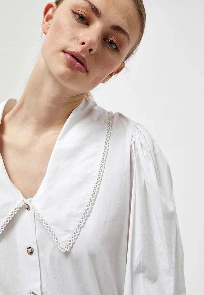 Lovely white shirt. The shirt has the nicest collar. The collar is large and has beautiful details along the edge. The shirt is closed by buttons.