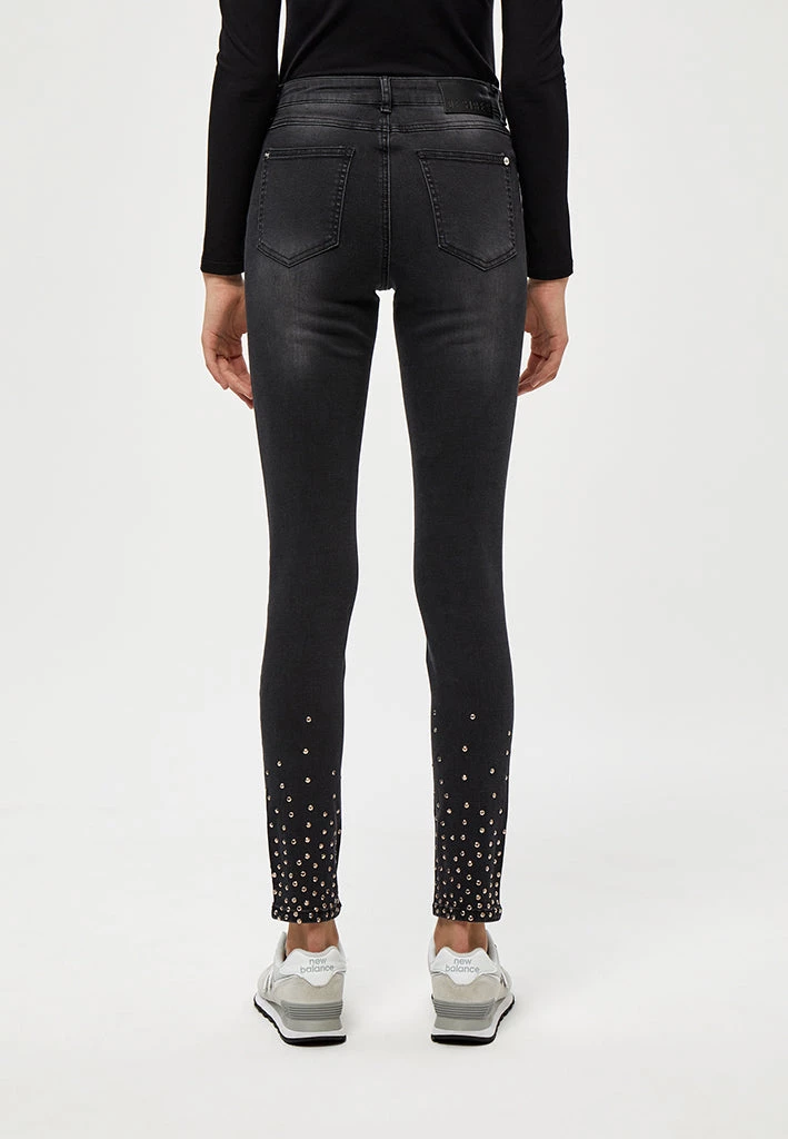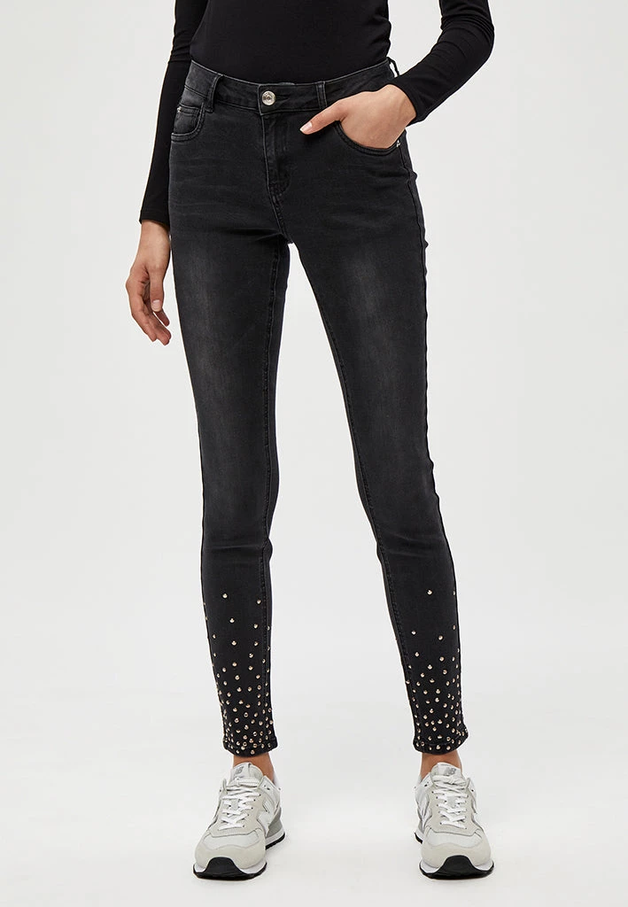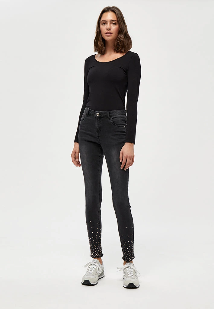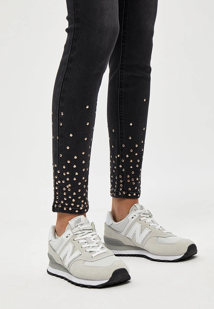 Cool black jeans. The jeans have belt straps, front pockets and back pockets. They have beautiful stones at the bottom making them more eye catching.