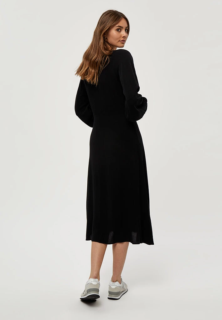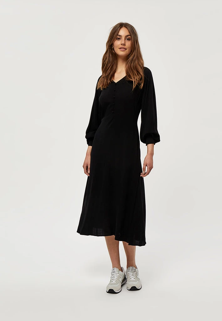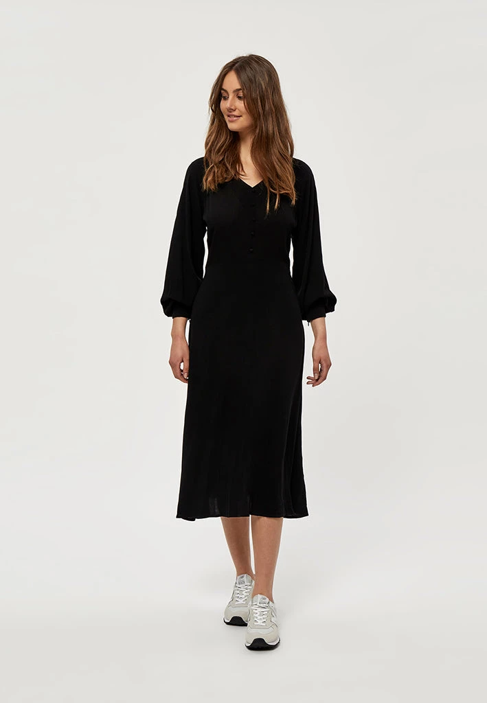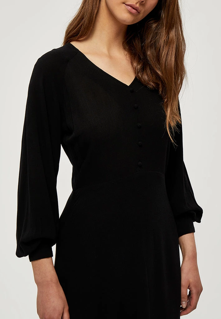 Beautiful dress. The dress has small buttons and a v-neck. It has lovely sleeves with cuffs.
