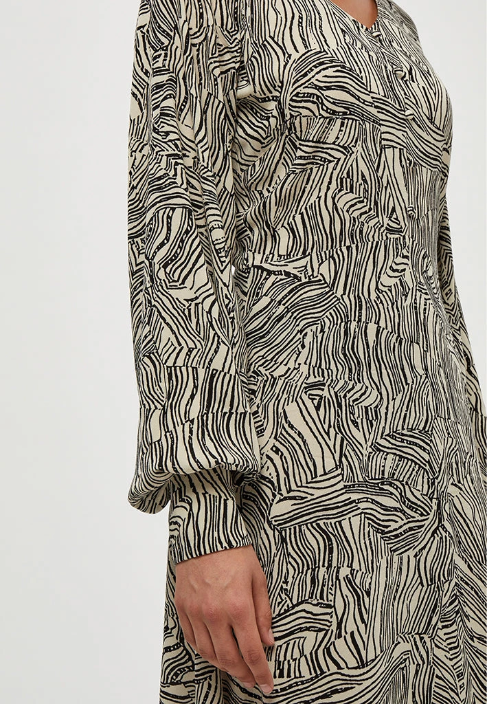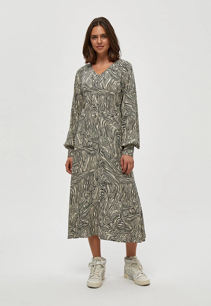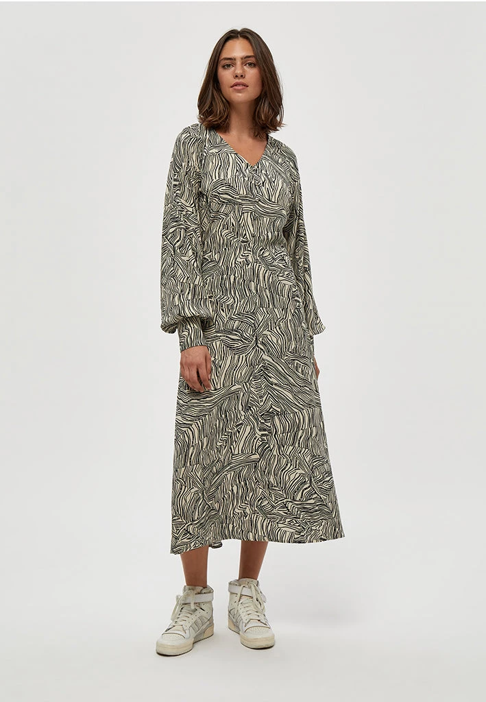Beautiful dress. The dress has small buttons and a v-neck. It has lovely sleeves with cuffs.