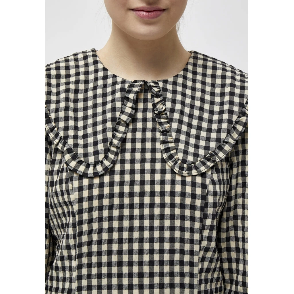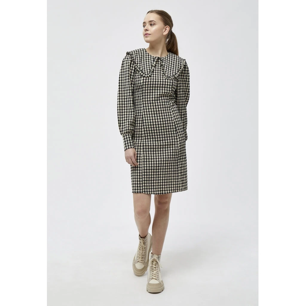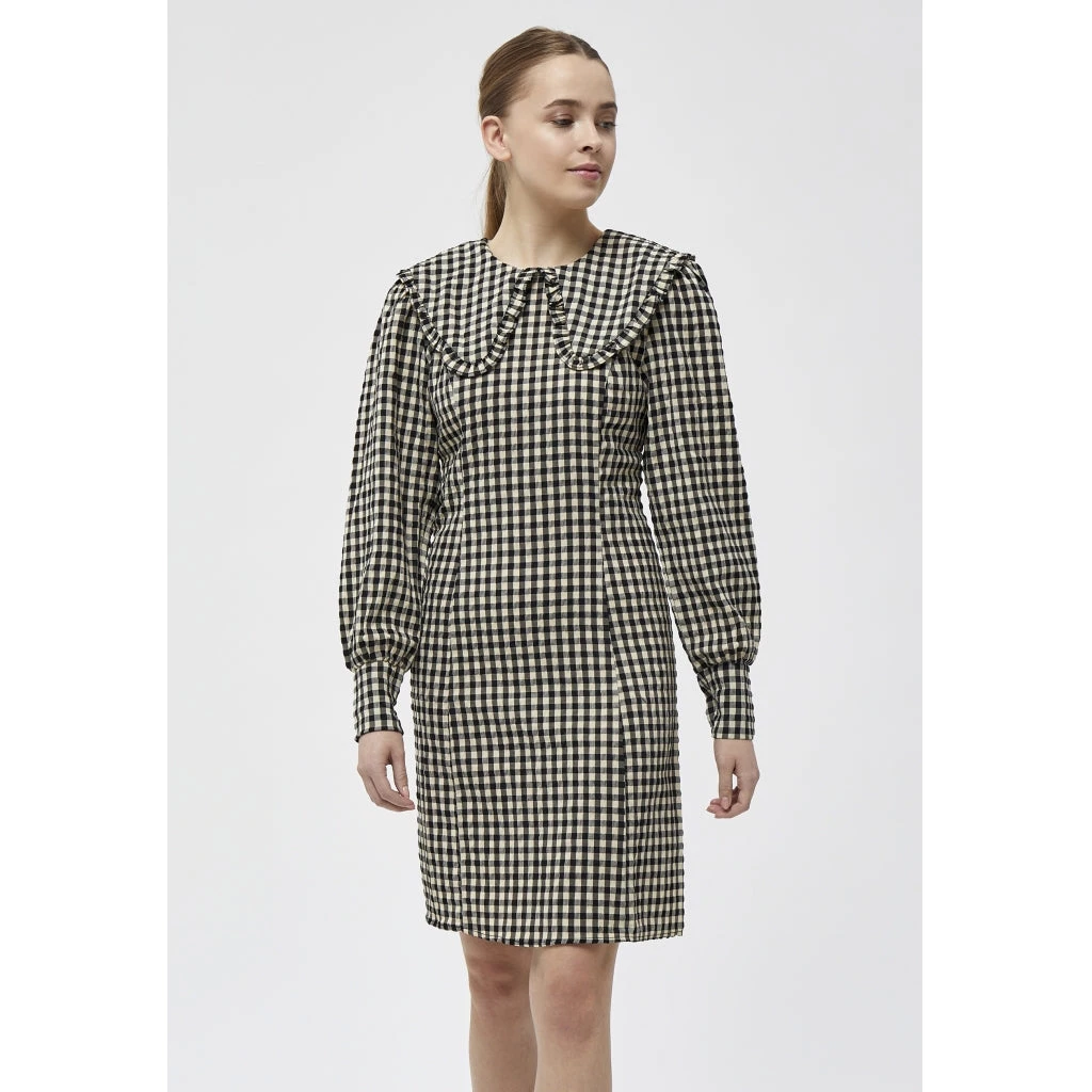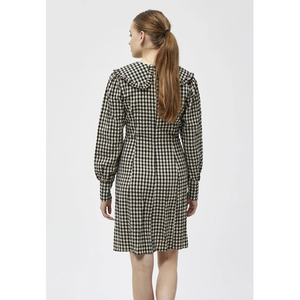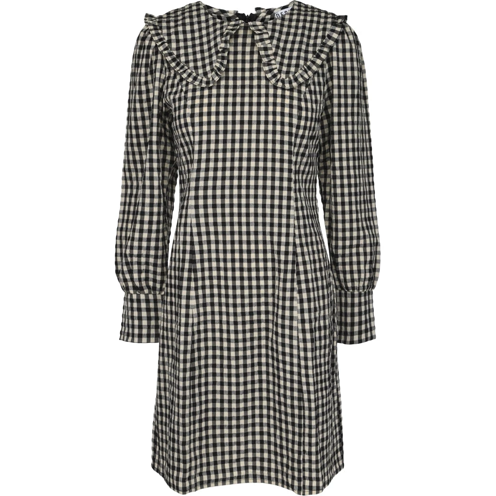 Cool and stylish dress. The dress has long sleeves and a large collar with frill details. The dress is in a cool check pattern in a rustic material. It is figurefitted which makes it more feminin.