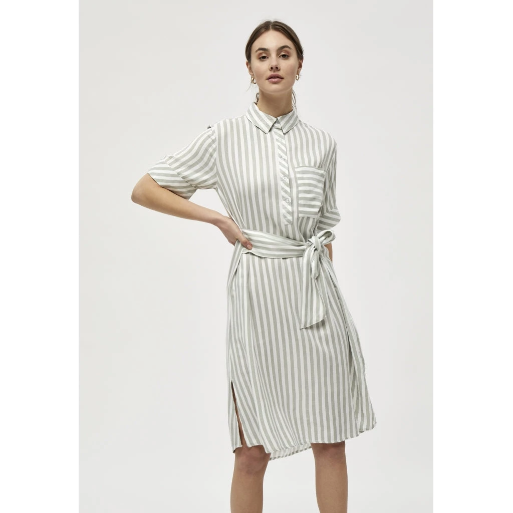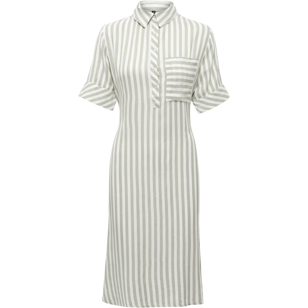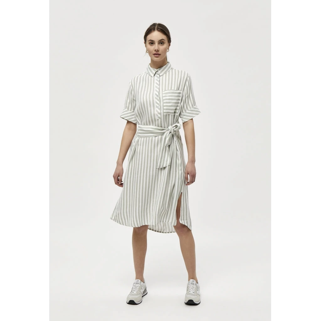 The dress has a shirt collar, button-down front half, single chest pocket, short sleeves and tie-waist in the back – and did we mention that Fenny is a striped beauty?