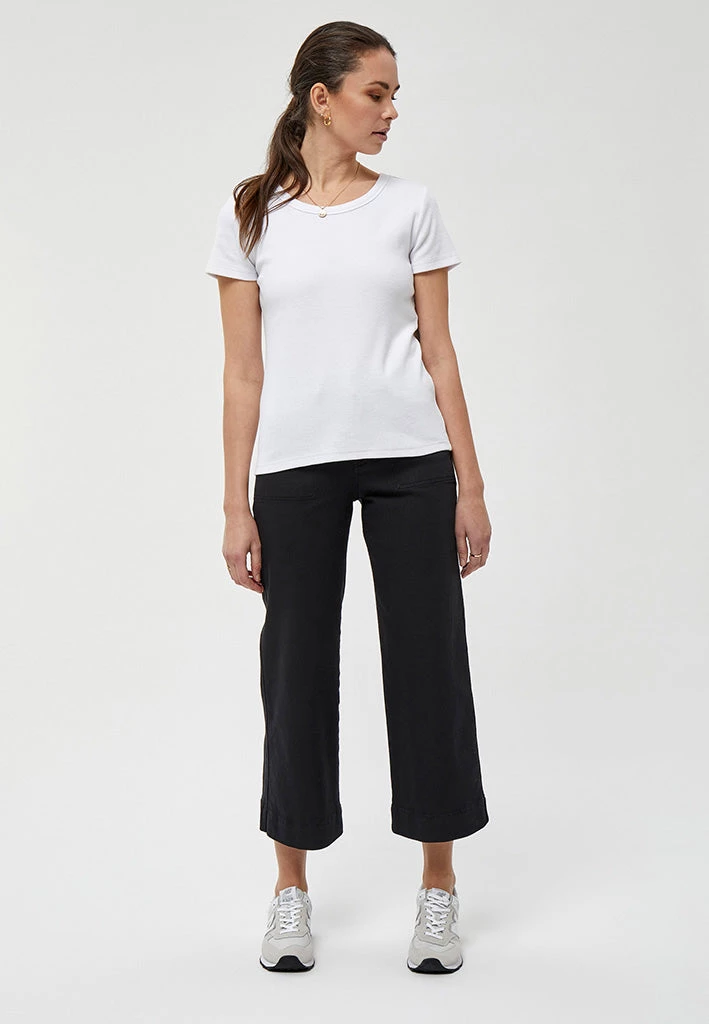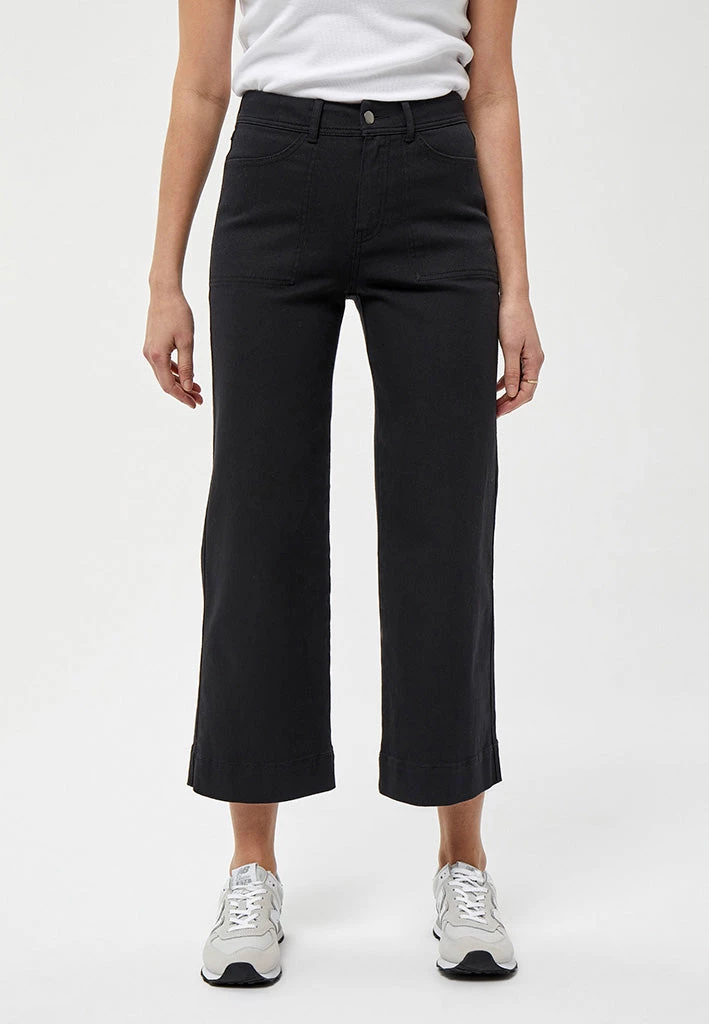 High waisted pants with button closure. The pants are flared at the bottom and are ankle length.