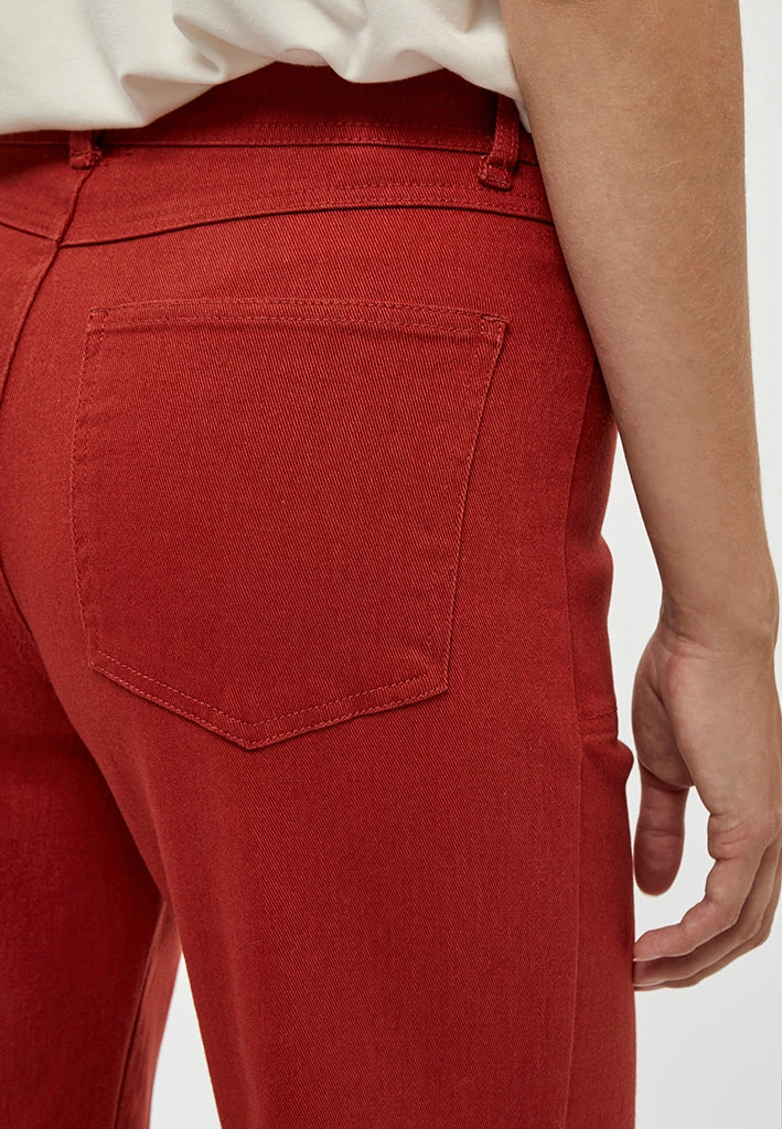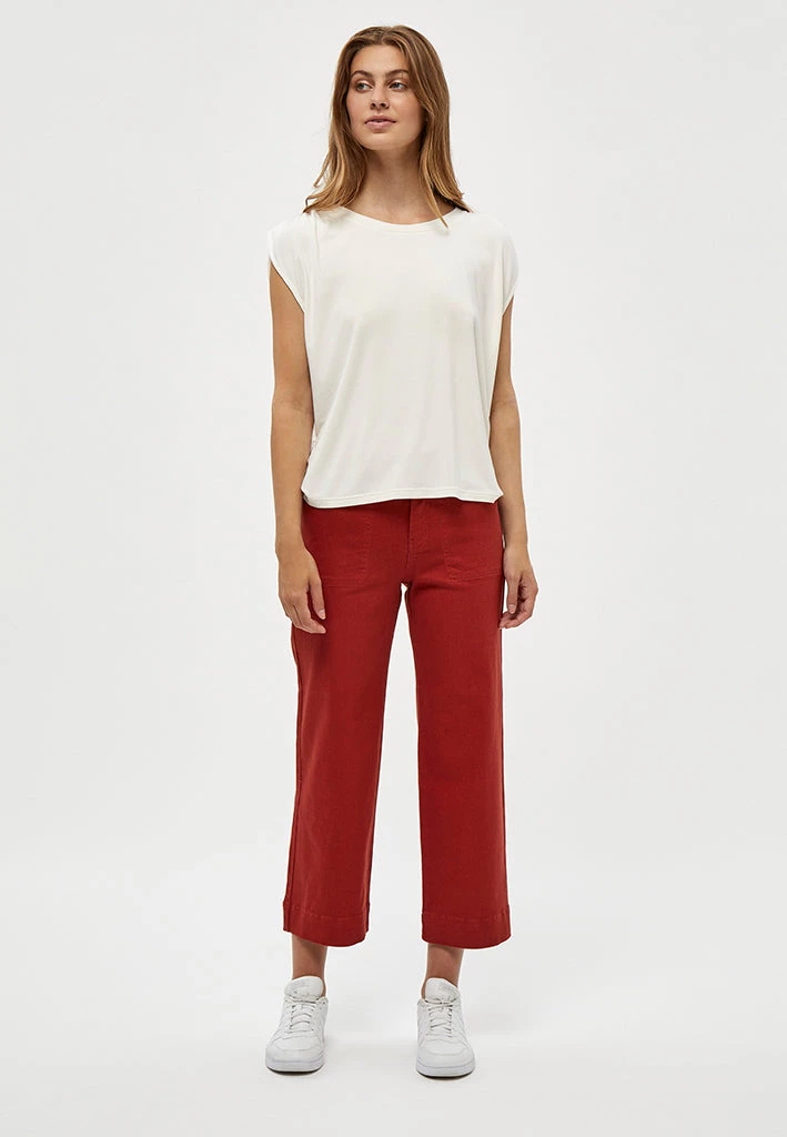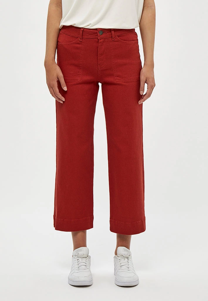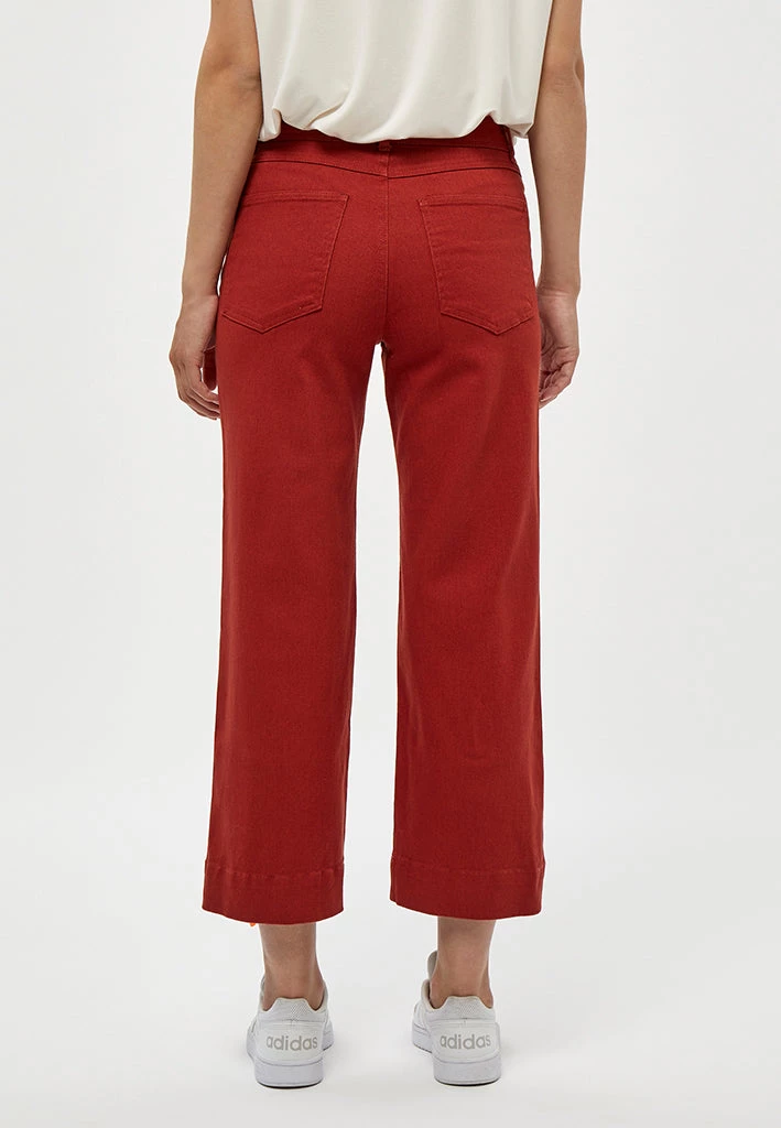 High waisted pants with button closure. The pants are flared at the bottom and are ankle length.