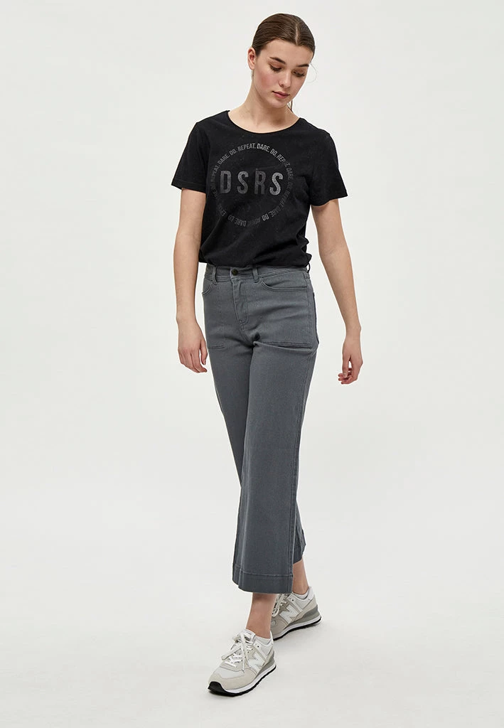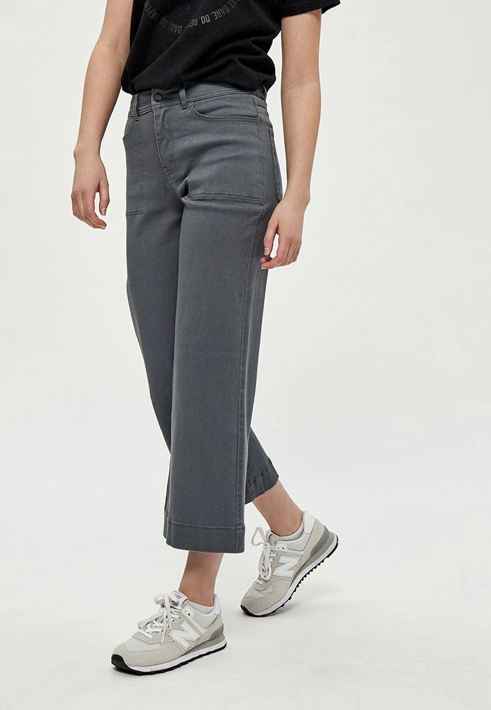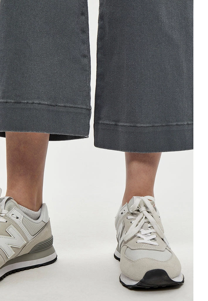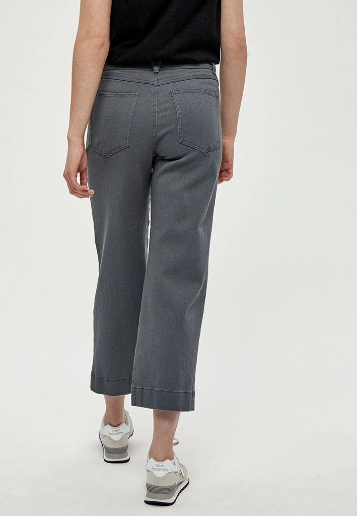 High waisted pants with button closure. The pants are flared at the bottom and are ankle length.
