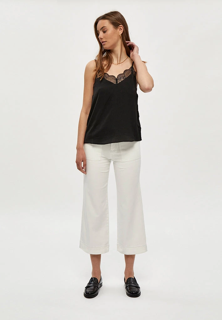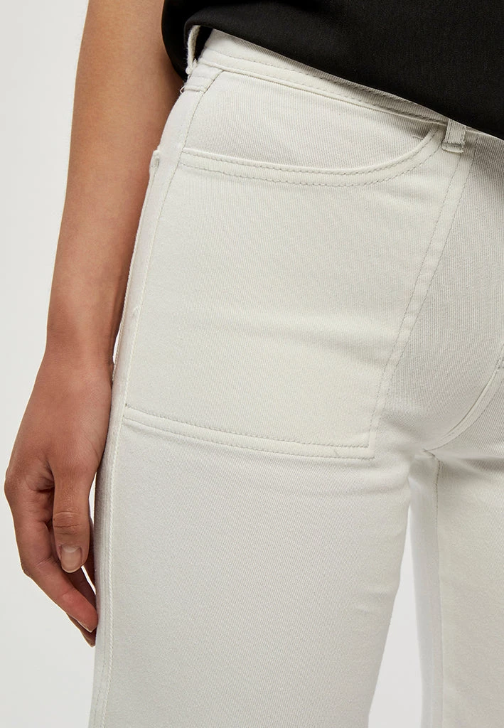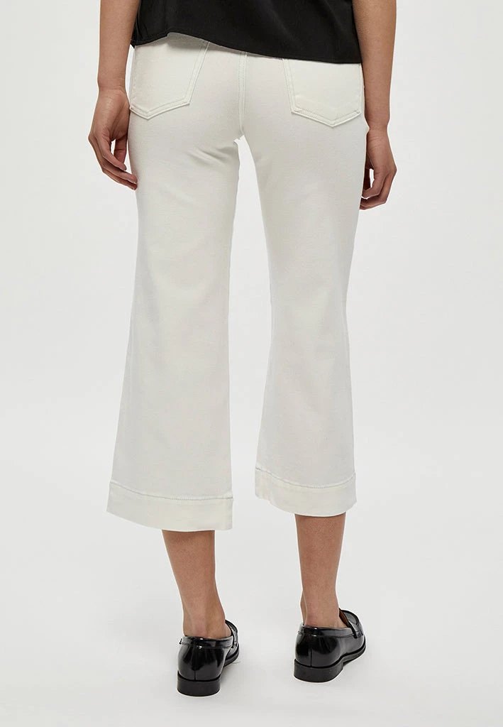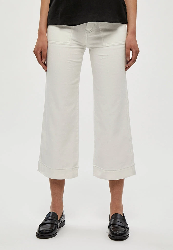 High waisted pants with button closure. The pants are flared at the bottom and are ankle length.