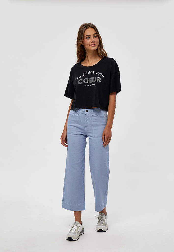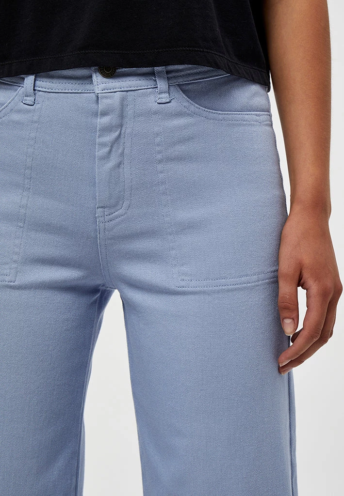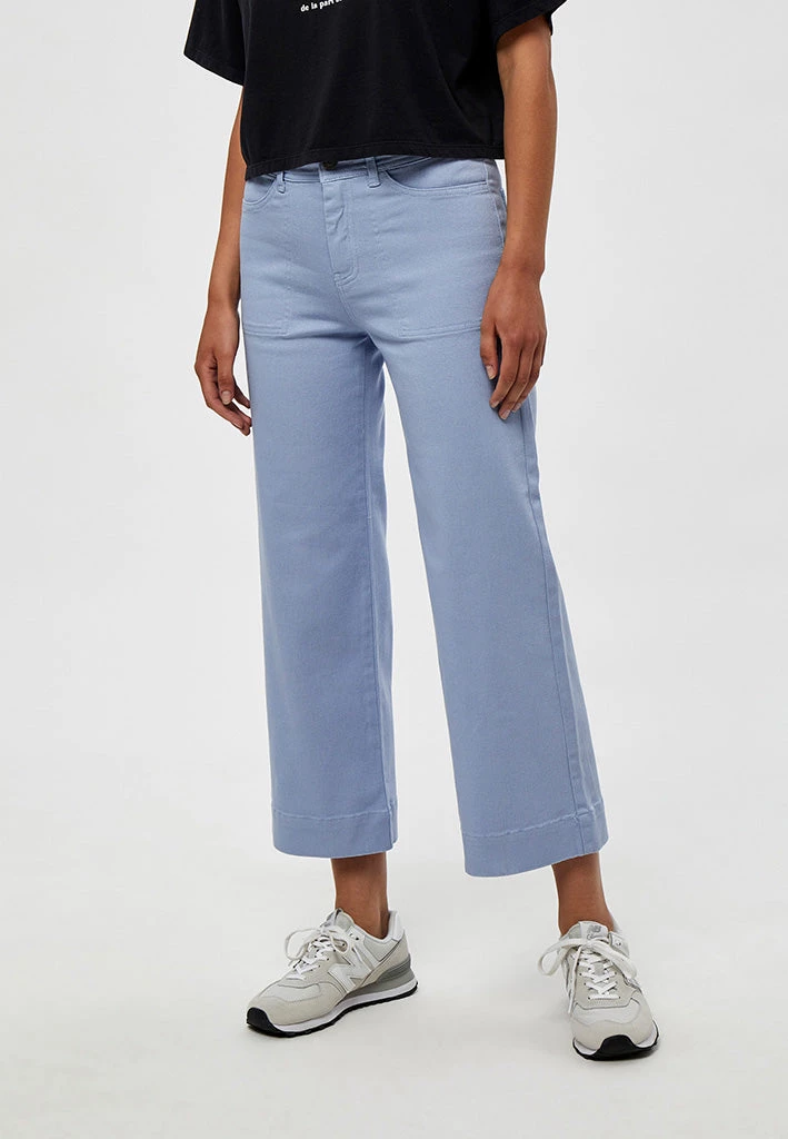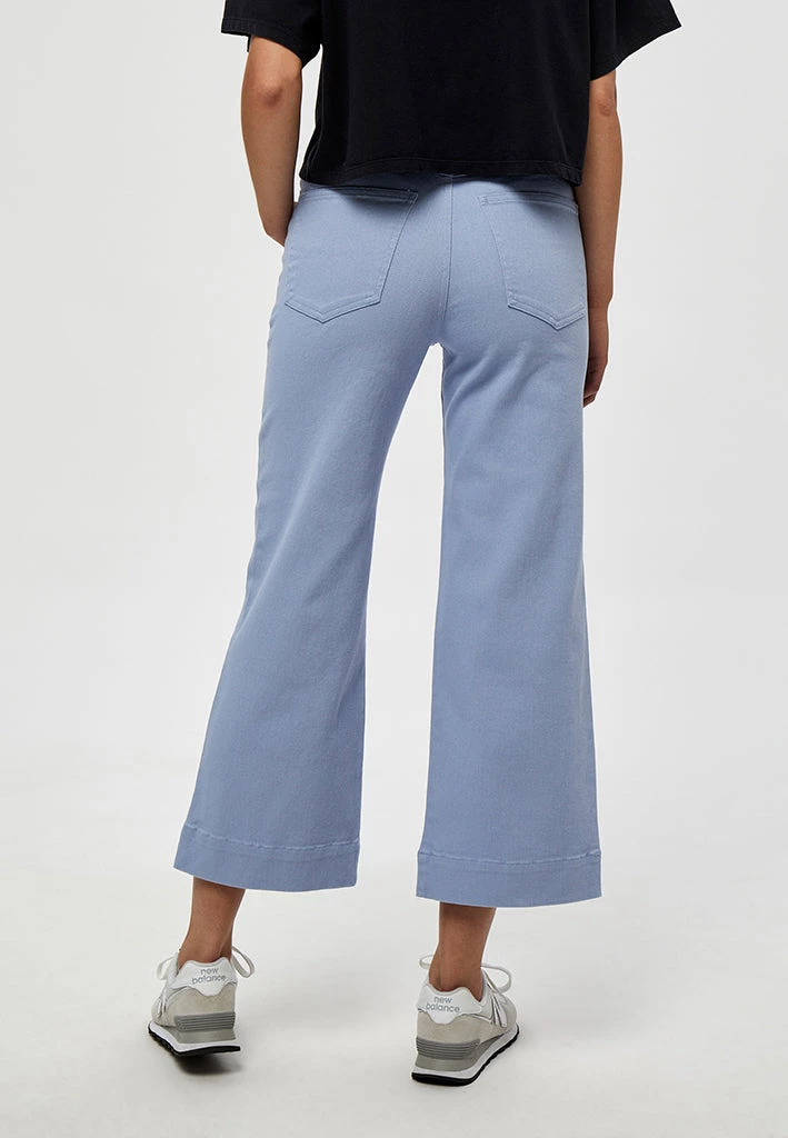 High waisted pants with button closure. The pants are flared at the bottom and are ankle length.