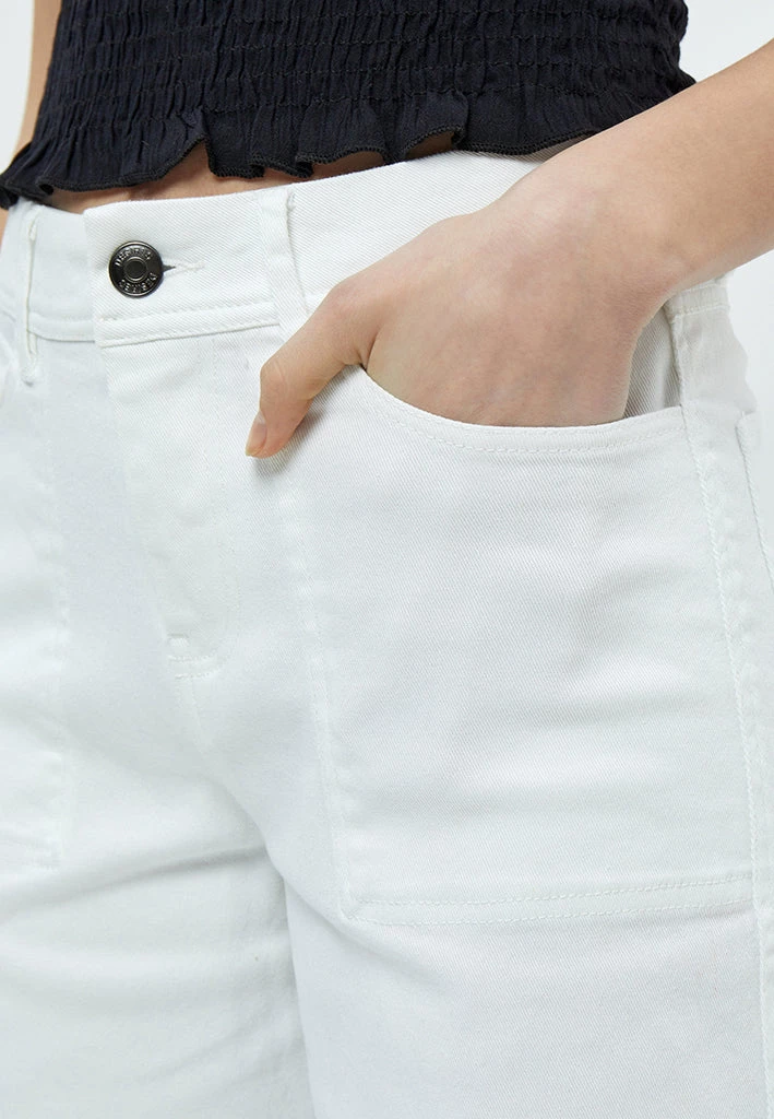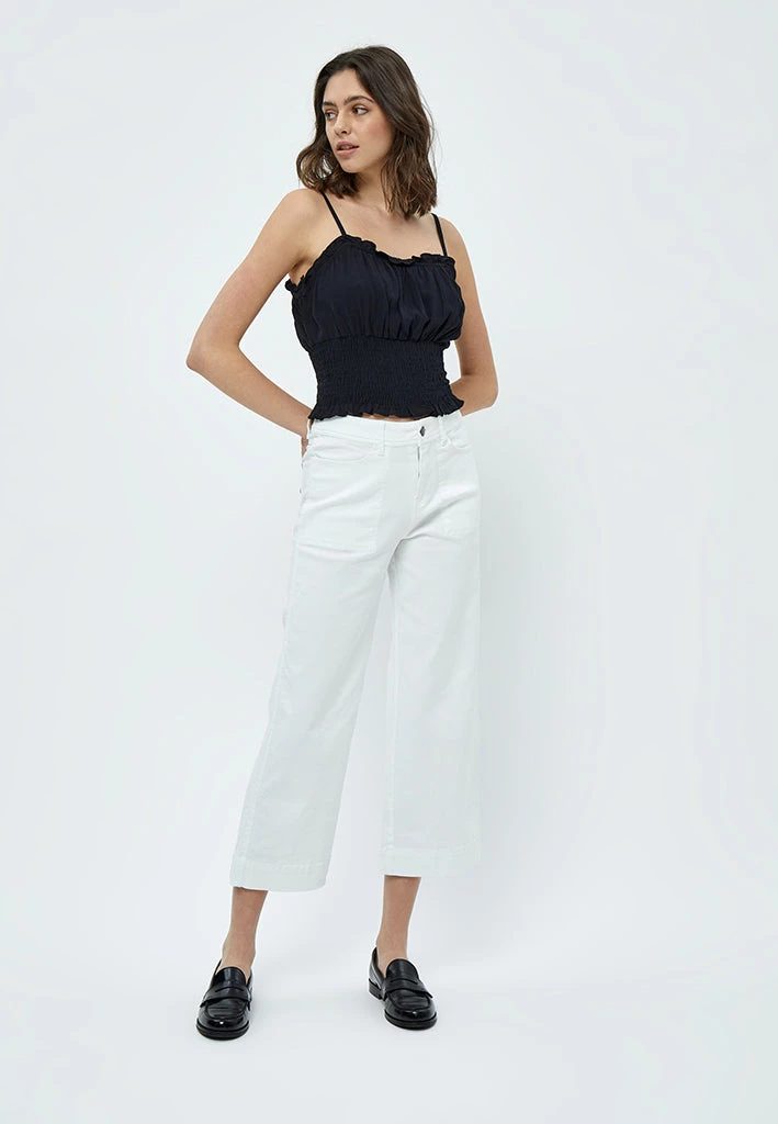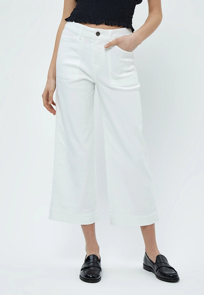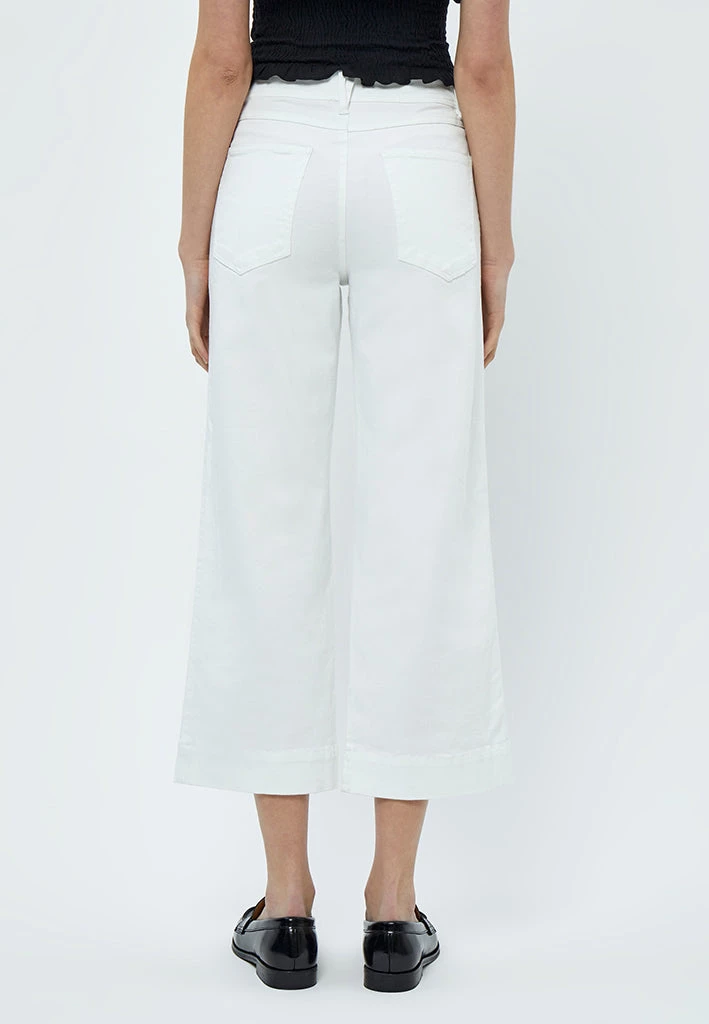High waisted pants with button closure. The pants are flared at the bottom and are ankle length.