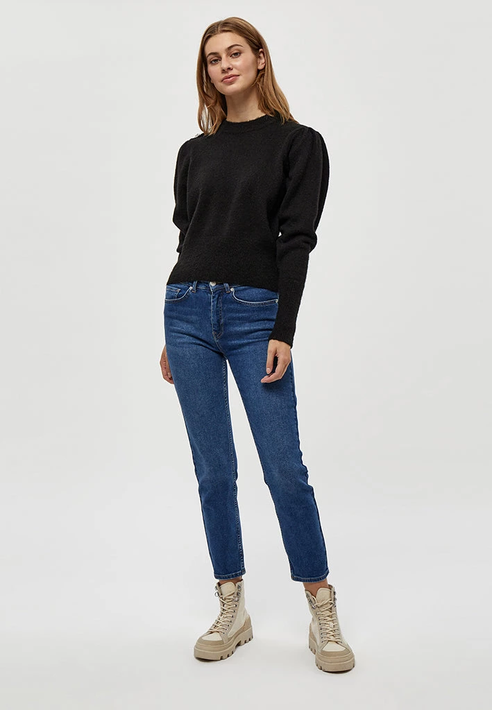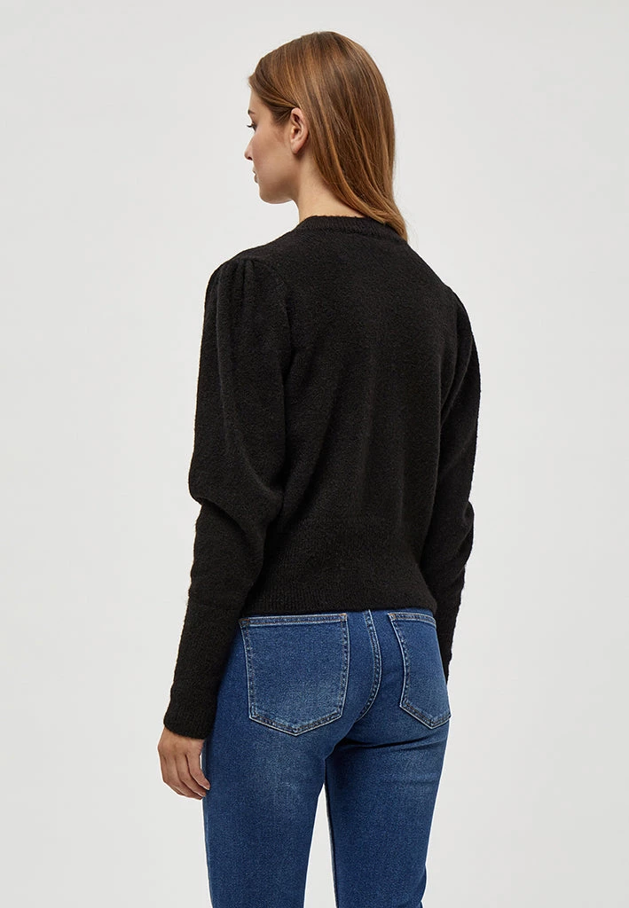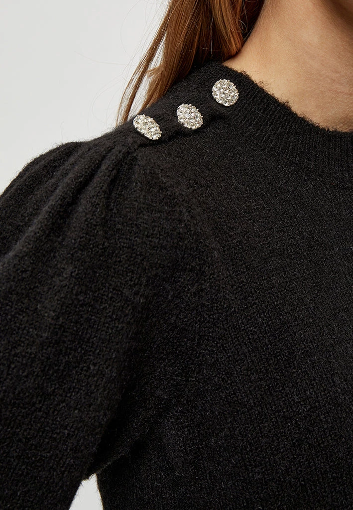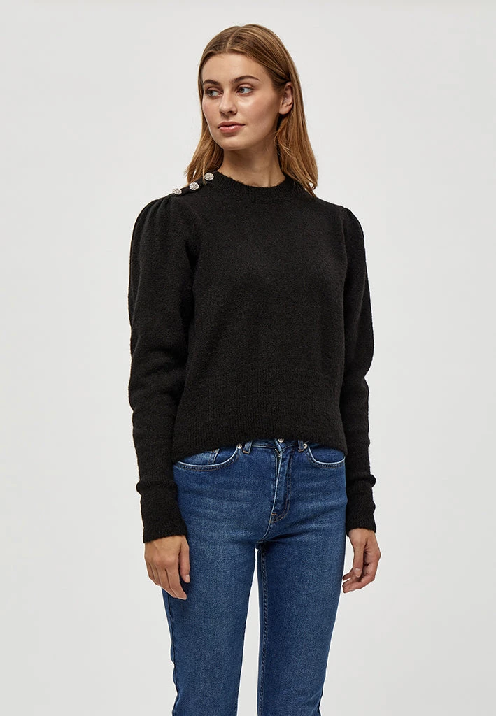 Lovely knit with nice details. The knit has rib at the bottom, by the neck and at the bottom of the sleeves. It has beautiful buttons on one of the shoulders.
