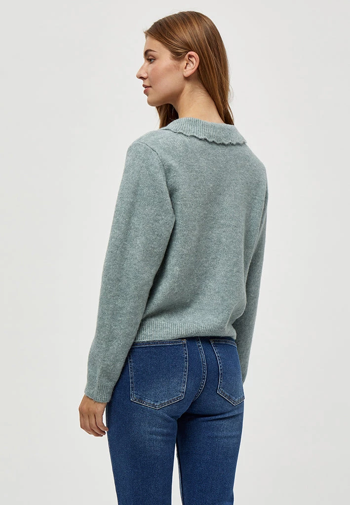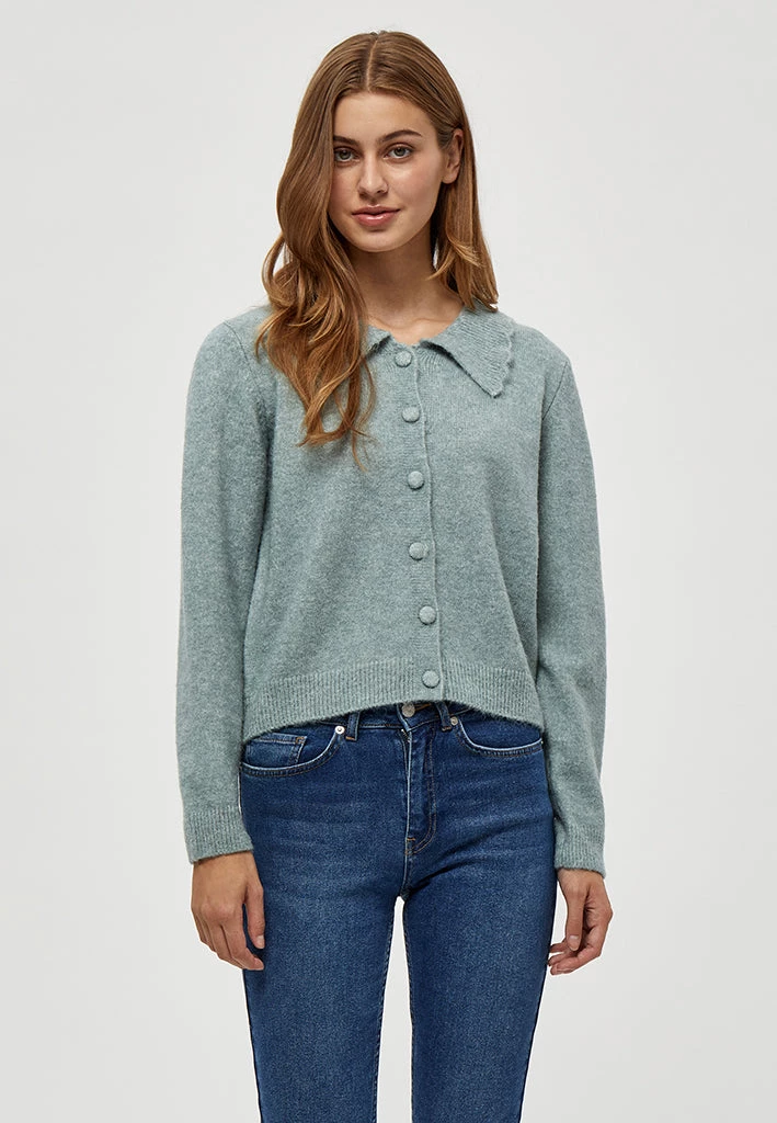 Beautiful cardigan with collar. The cardigan is closed with fabric covered buttons. It is comfortable and stylish.