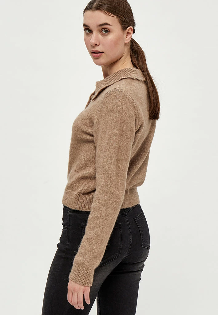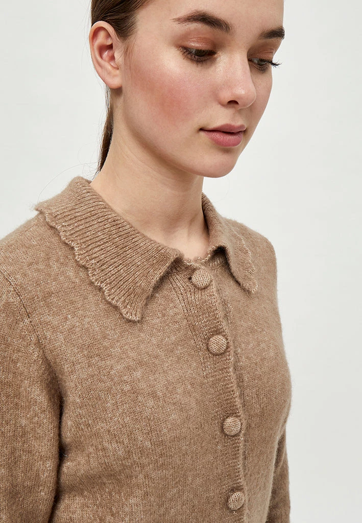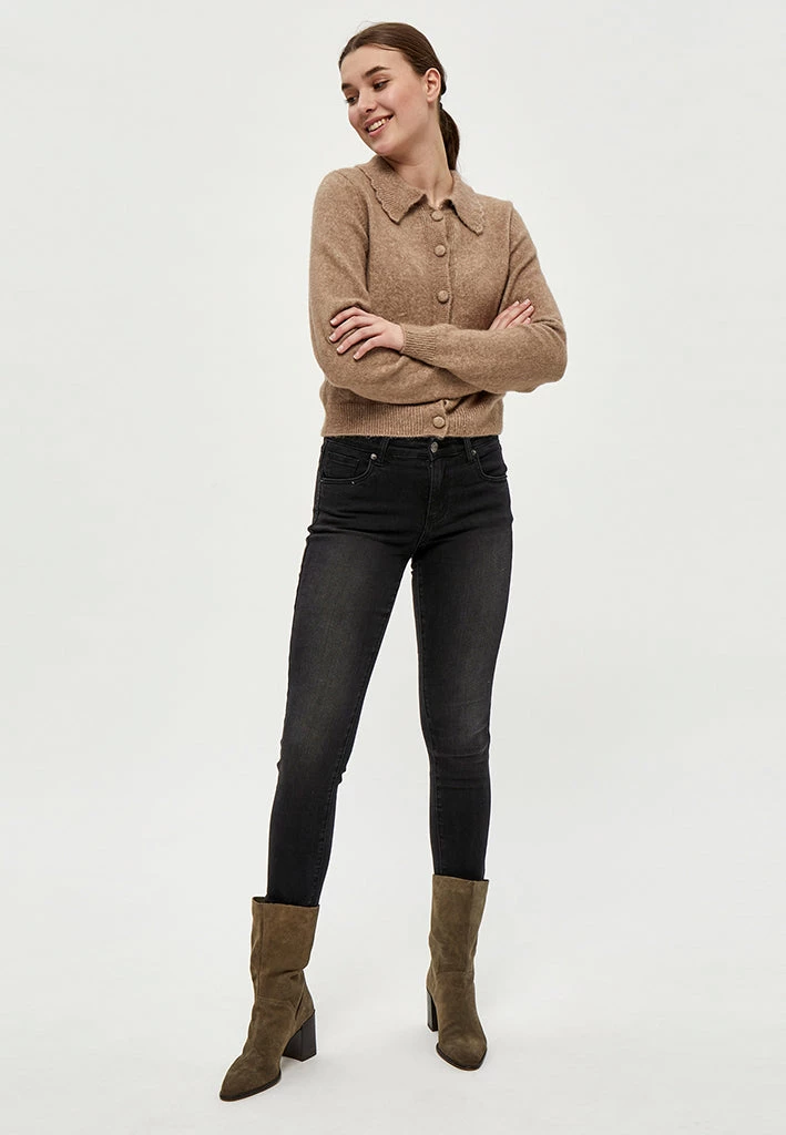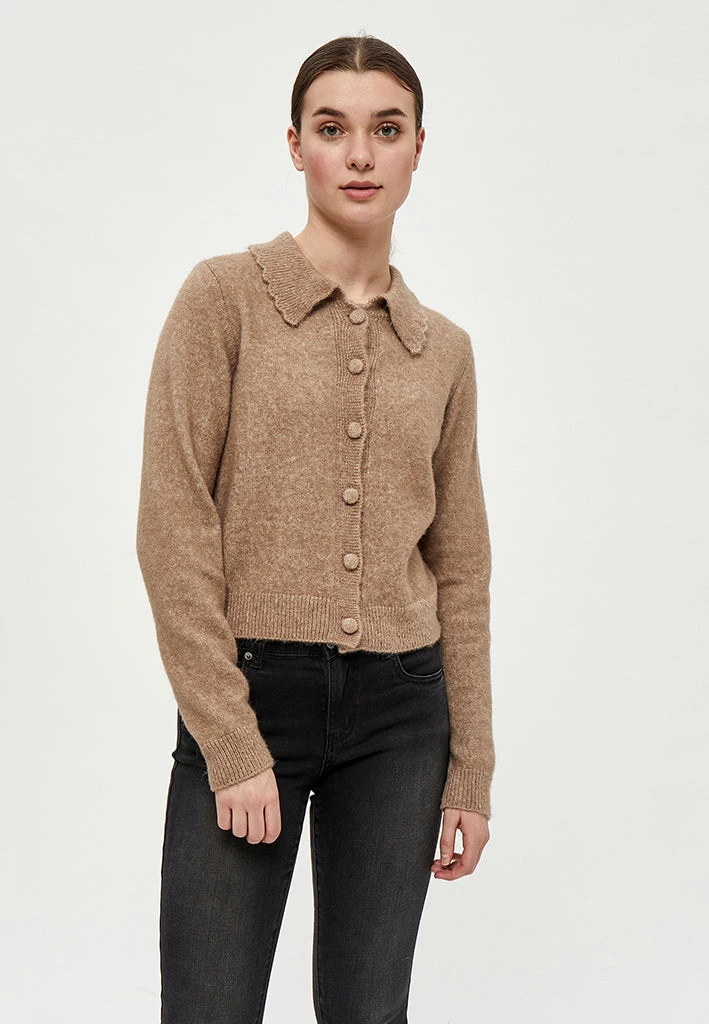 Beautiful cardigan with collar. The cardigan is closed with fabric covered buttons. It is comfortable and stylish.