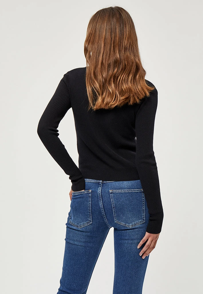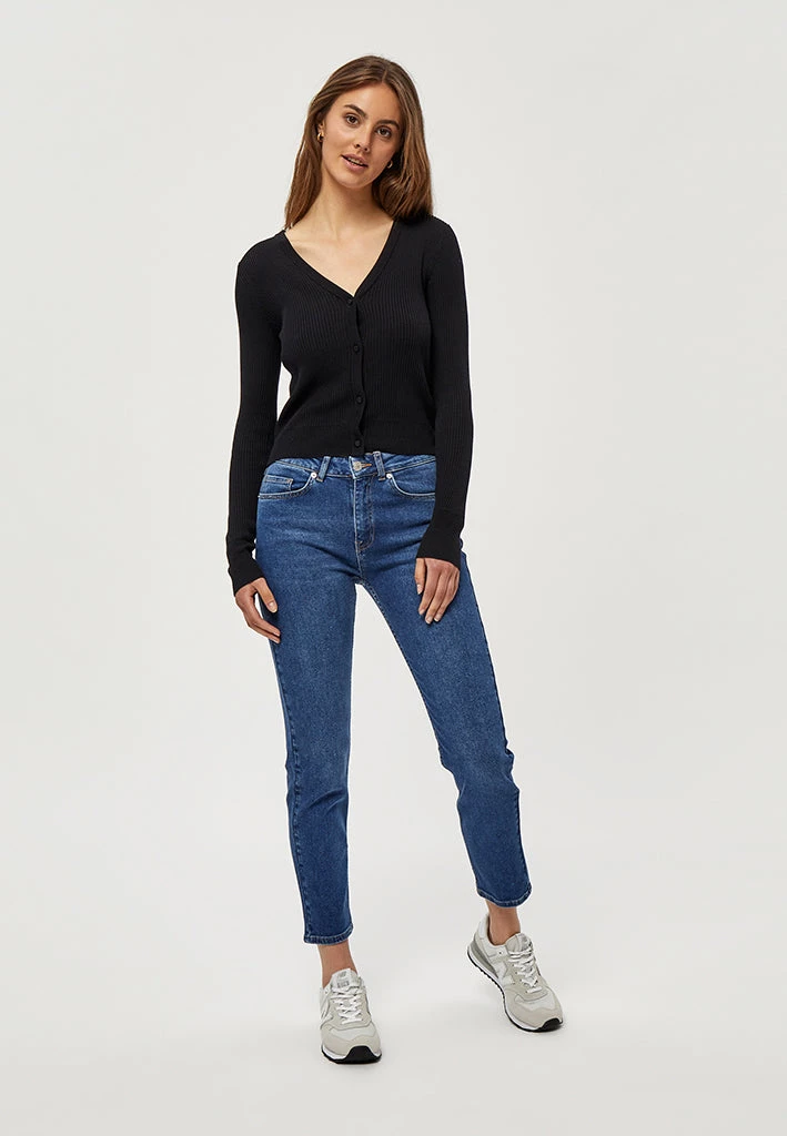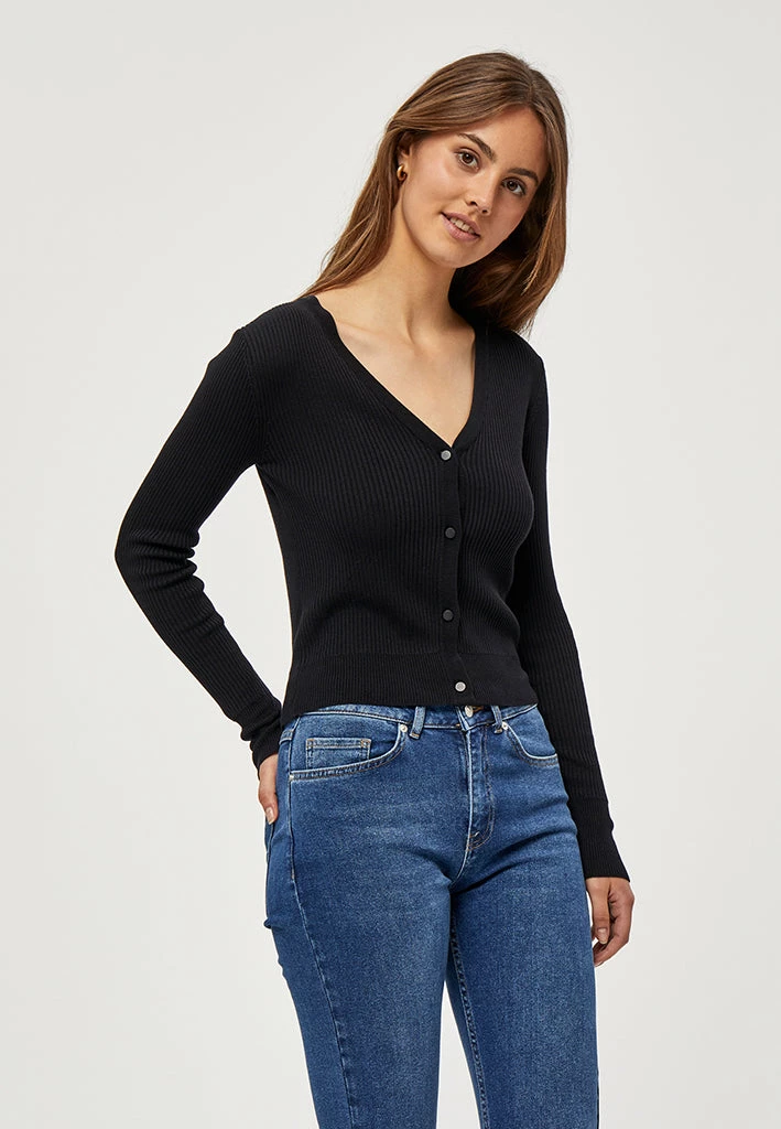 Lovely cardigan with rib. The cardigan is tightly fitted and has long sleeves. It has a v-neck and is closed by buttons.