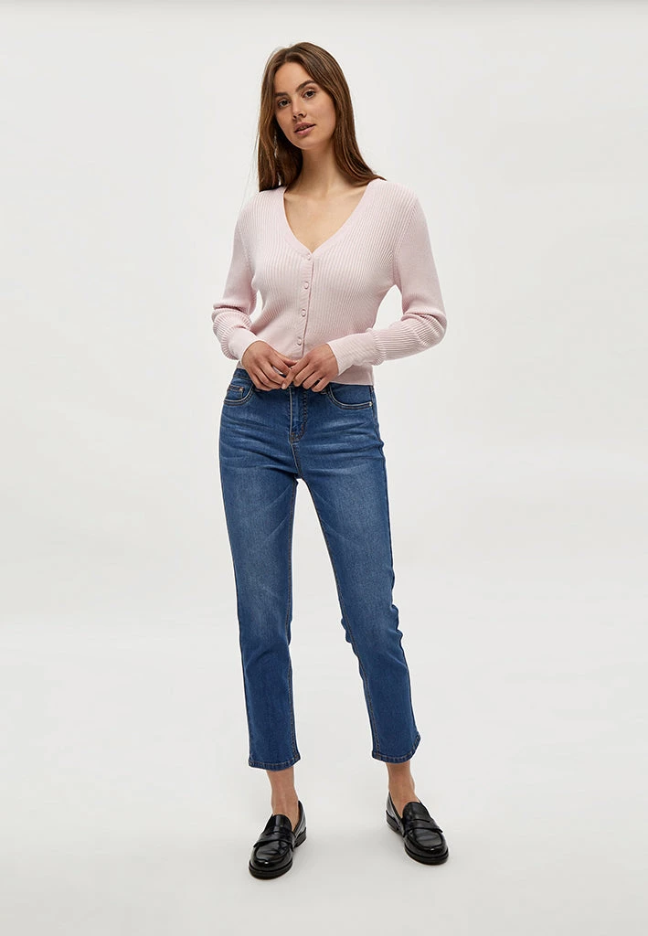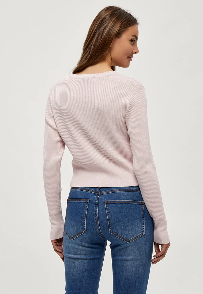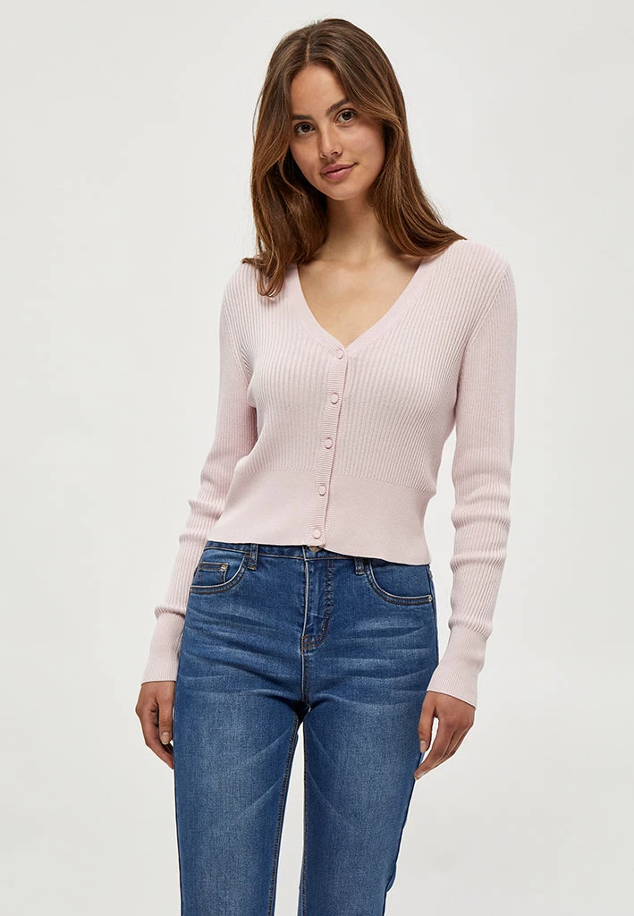 Lovely cardigan with rib. The cardigan is tightly fitted and has long sleeves. It has a v-neck and is closed by buttons.