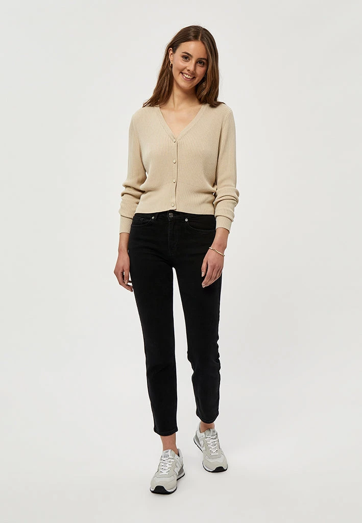 Lovely cardigan with rib. The cardigan is tightly fitted and has long sleeves. It has a v-neck and is closed by buttons.
