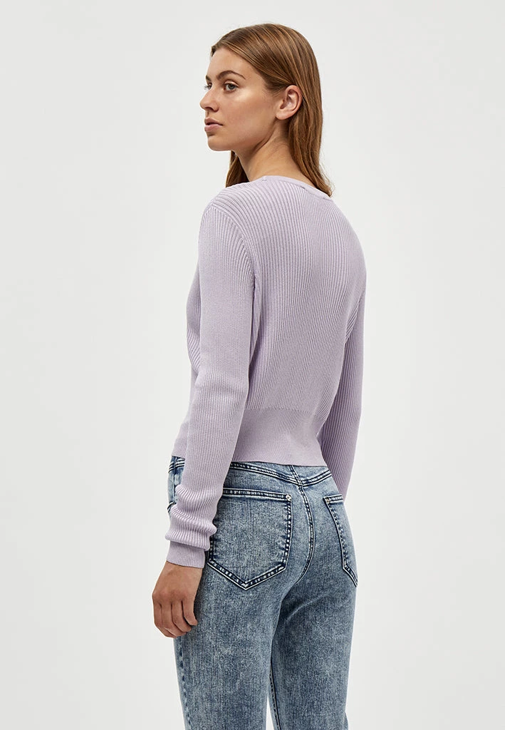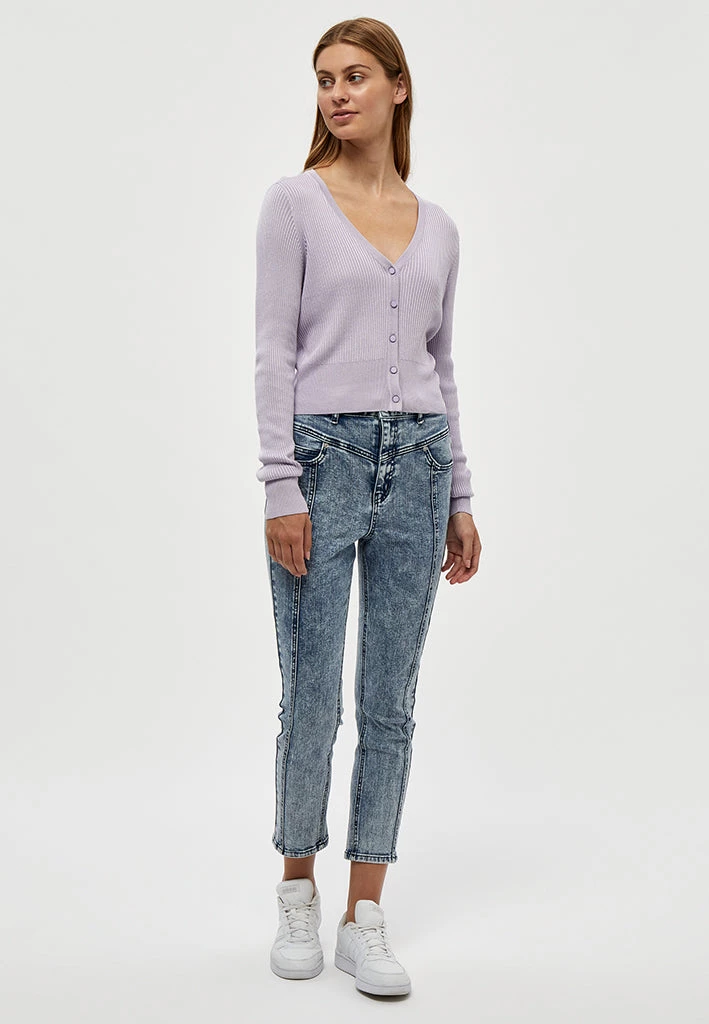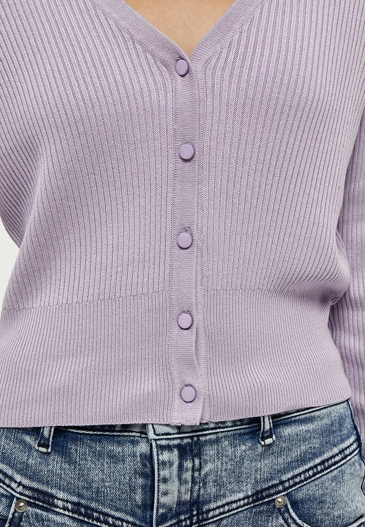 Lovely cardigan with rib. The cardigan is tightly fitted and has long sleeves. It has a v-neck and is closed by buttons.