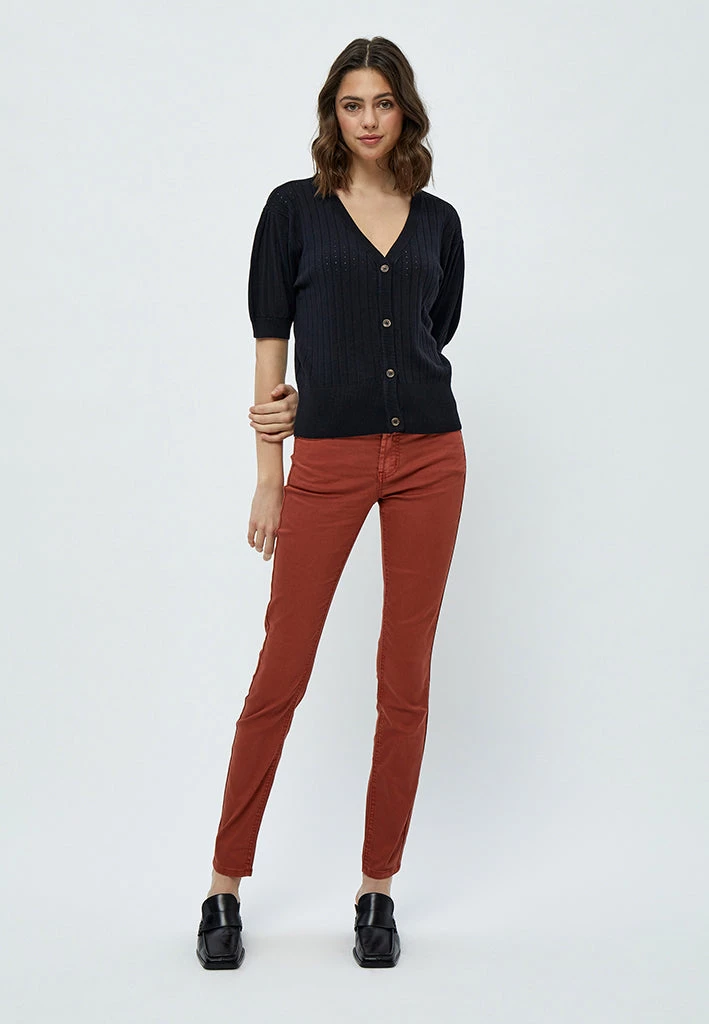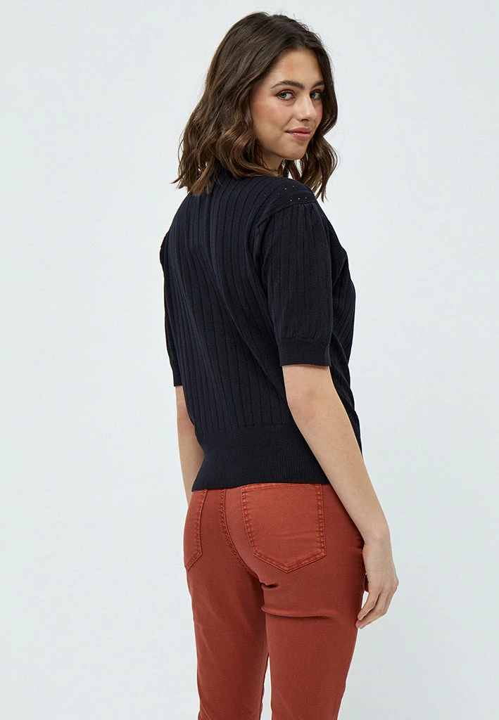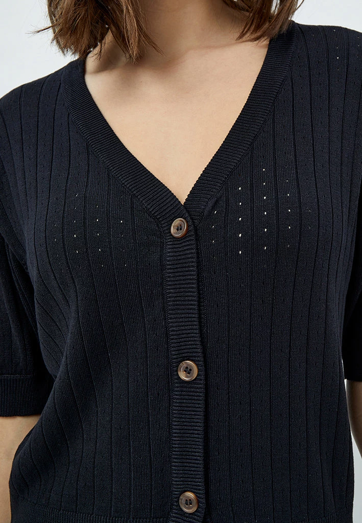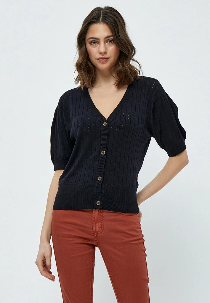 Lovely cardigan with rib in holepattern. The cardigan has short sleeves with a slight pouf sleeve. It has a v-neck and is closed by buttons.