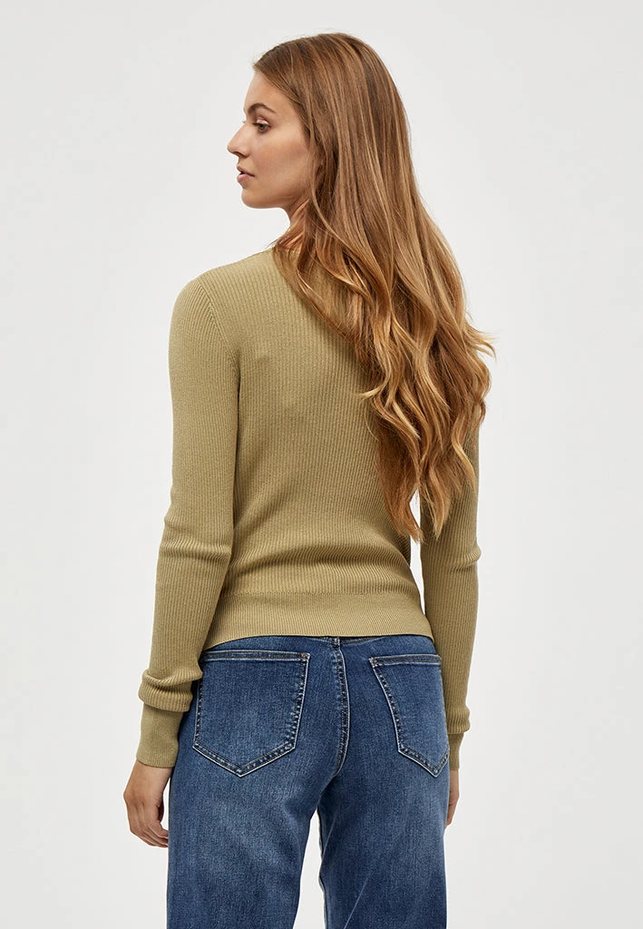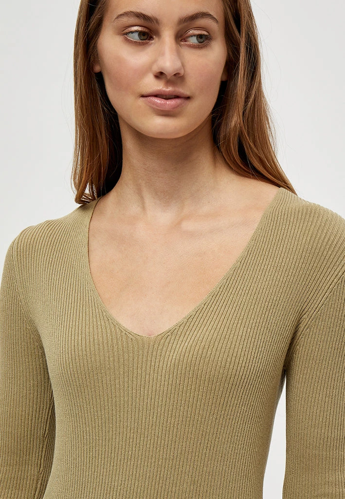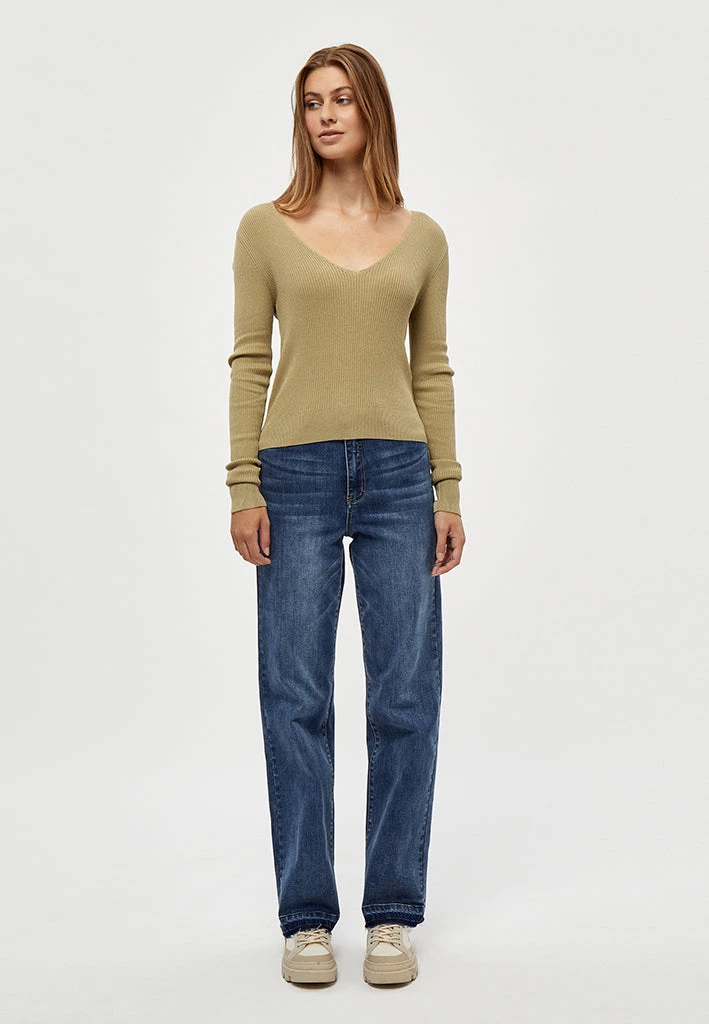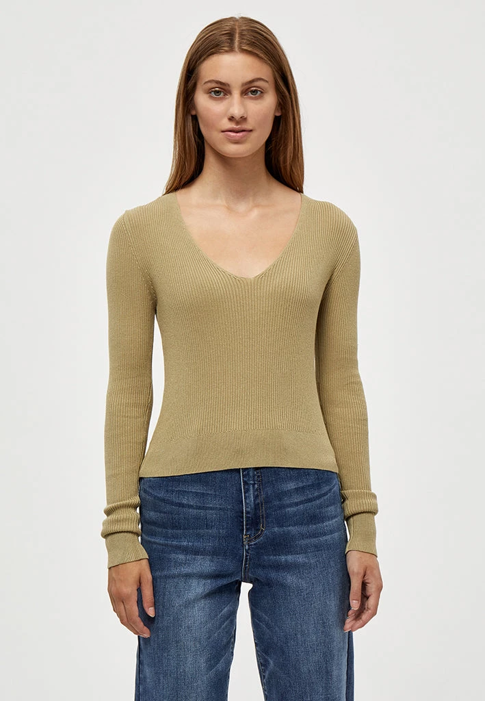 Lovely simple knit blouse. The blouse has rib and a deep neck. It is easy to style with jeans or pants.