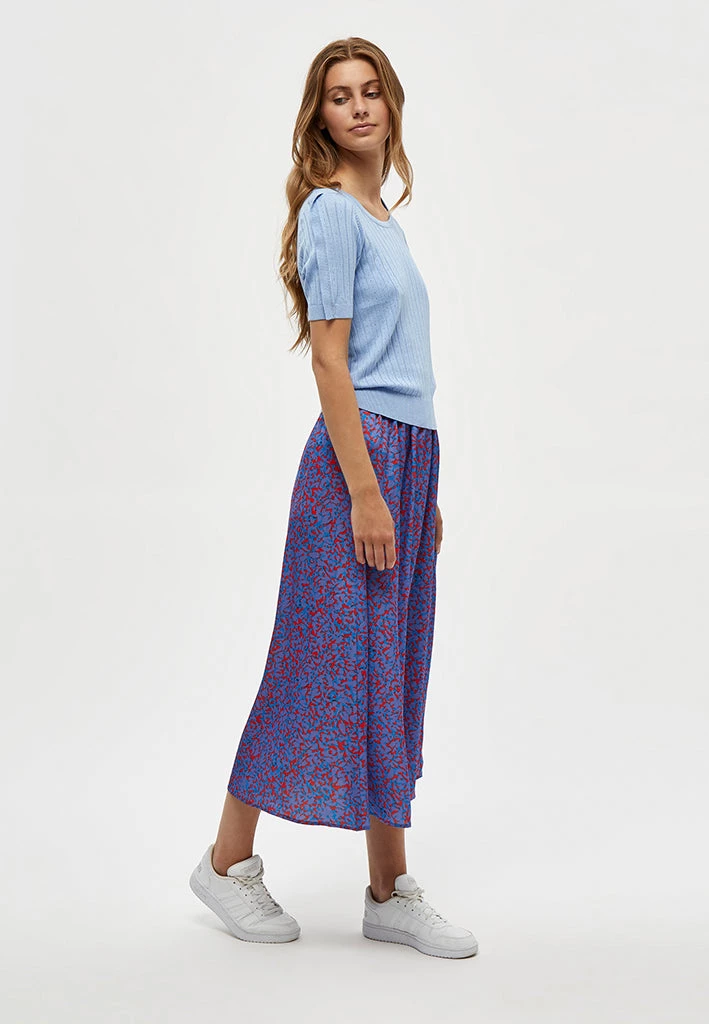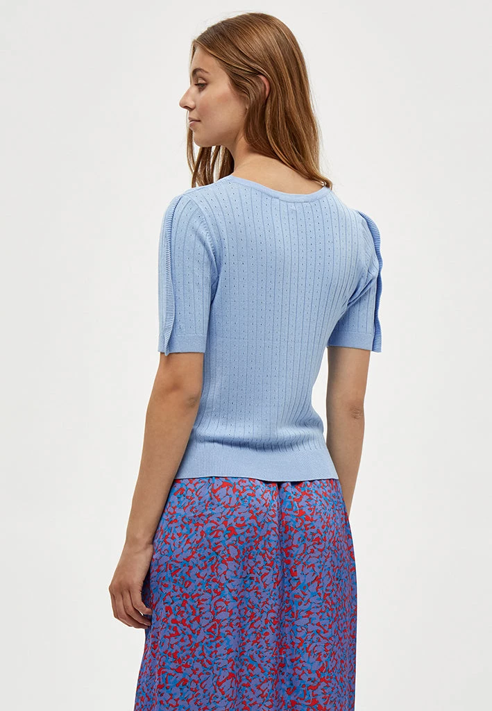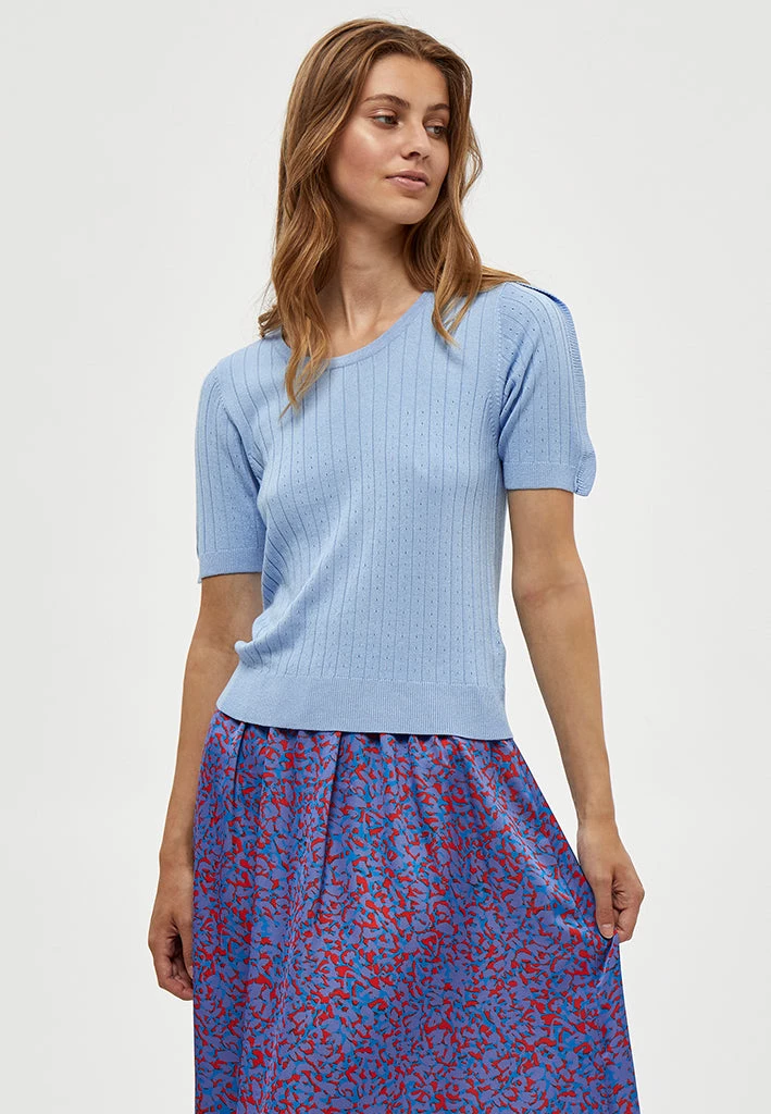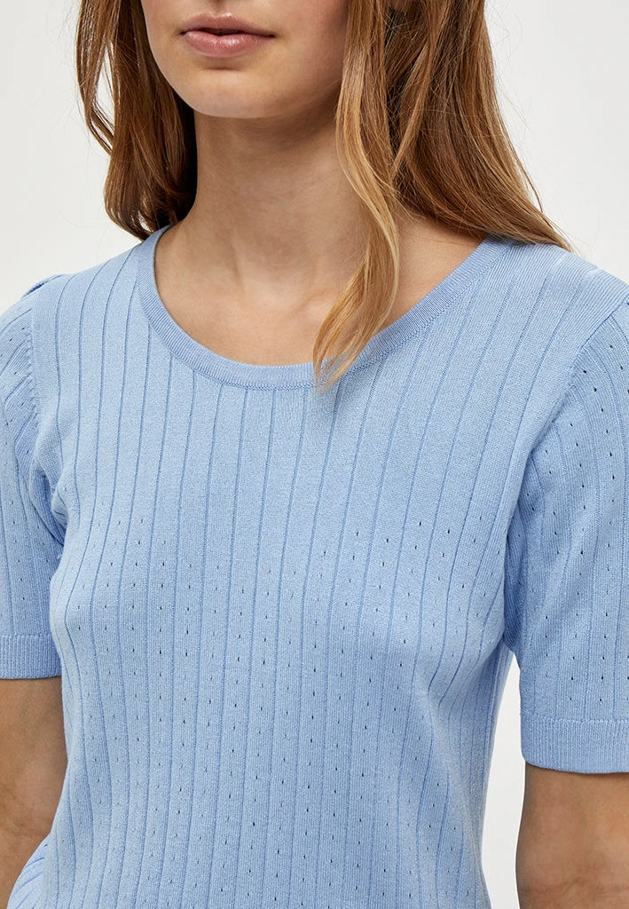A beautiful blouse with ribs in a holepattern. It has short sleeves with ruffles for an extra detail as well as a round neckline.