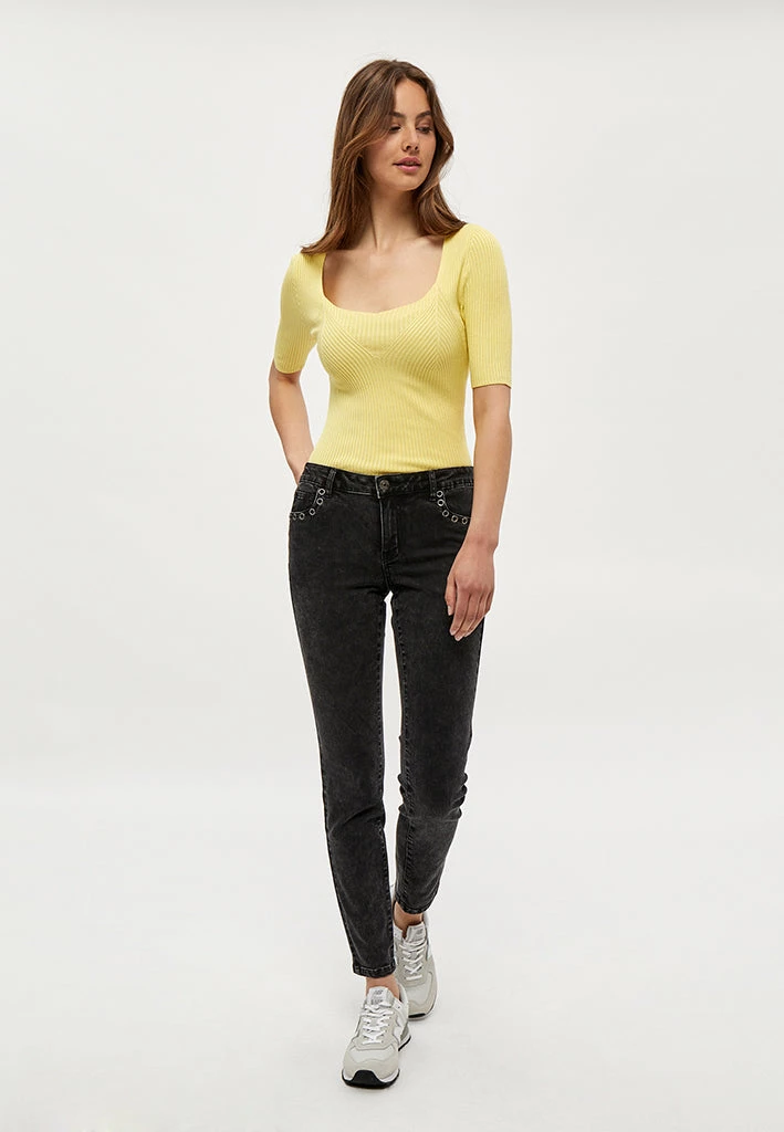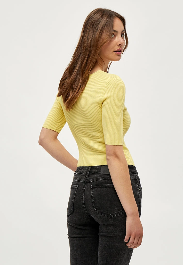Lovely tee with rib. The tee is tightly fitted and has a slightly deep neckline. Feminin and easy to style.